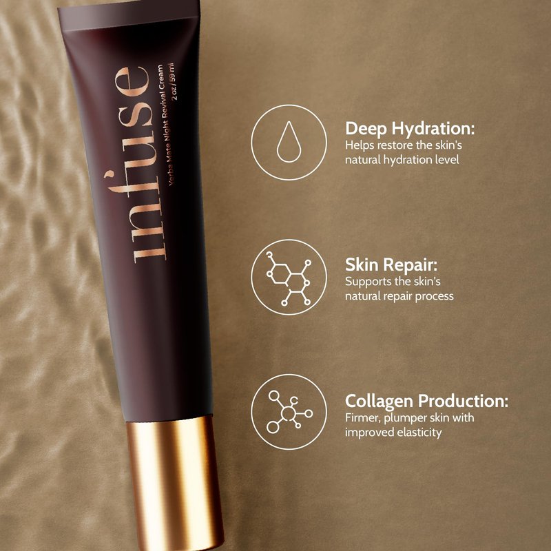 Discover our Infuse Yerba Mate Night Revival Cream—a hydrating, revitalizing night cream. Packed with antioxidants, it nourishes your skin overnight. Specifically designed for mature skin, it promotes renewal, hydration, and a radiant morning glow. Incorporate it into your nightly skincare routine for a refreshed appearance every day.
