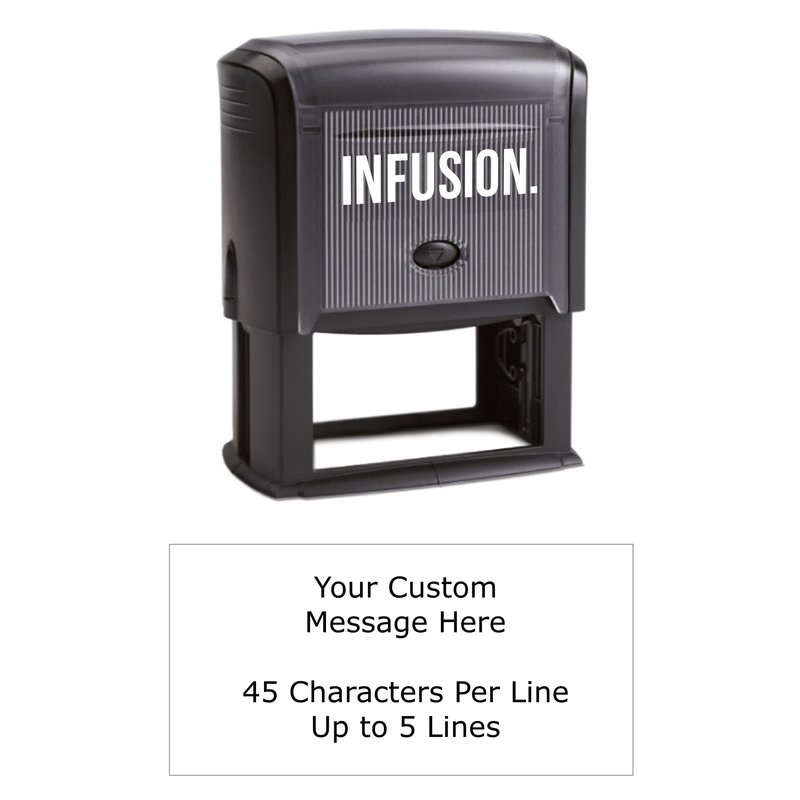 This customizable Infusion self-inking rubber stamp (built on Trodat 4926 housing) is perfect for business or personal use such as return addresses, bank deposits, custom labels and more. It has a large rectangular impression area of 1-1/2" x 3" that will allow you to personalize your stamp up to 5 lines with up to 45 characters per line. Get yours now and choose your ink from 16 available colors!
