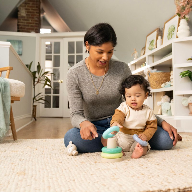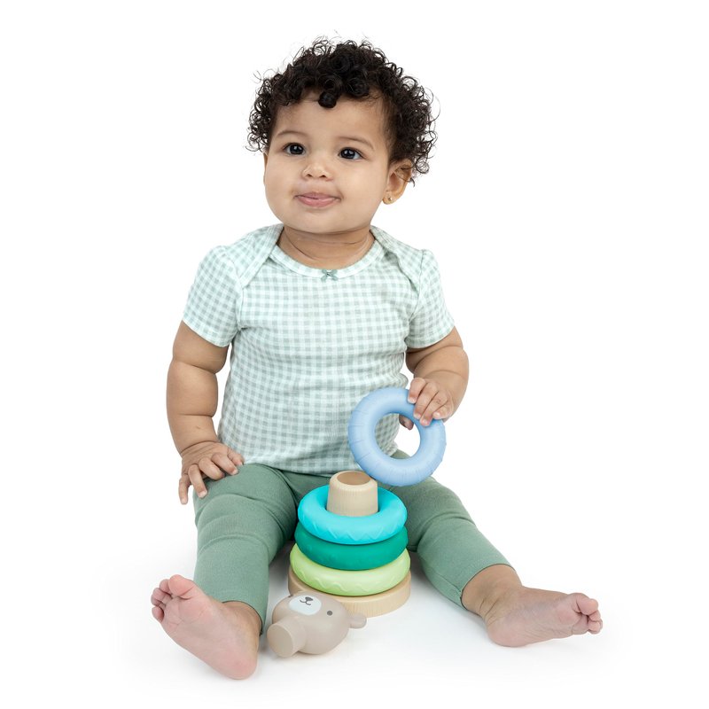 Ingenuity: ity by Ingenuity Cutie Stacks, 4 BPA-Free Rings, Faux Wood Stand, Bear Topper, Unisex, for Ages 6 Months and Up - Nate