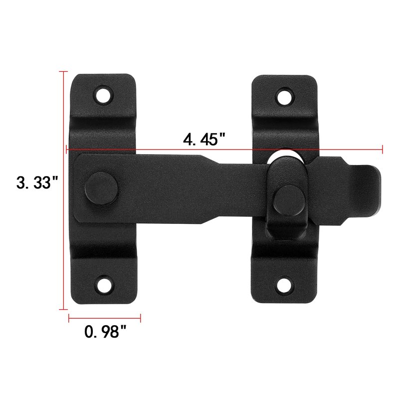 【Safety & Protection】—Thickened design makes the lock catch more firm and increases the anti-theft function. After closing the rocker, you can tighten the knob to fix the rocker to prevent it from being lifted from the outside 【size】— The length is about 4.33 in and the width is about 3.23 in. weighs about 0.31 pounds.please refer to the product size picture for details. 【Material & Features】— Gate Latch Is Constructed of High quality stainless steel, easy to clean,do not fade or rust,Matte Black finish,build to resist daily scratches,corrosion and tarnishing. 【Application】— Stainless steel barn sliding door locks are suitable for most door locks, It is suitable for door and window safety, fitting room, bathroom, cabinet, drawer, furniture, barn door, etc. it can also be used as the lock of small pet cage, to save space and design space for all wooden doors. 【Easy to Install】— The door latch is included 2 part: Rotating design, and each door latch had prepared 4 screws, easy to install and use. 【Package Included】—4 × Door latch, 16 × screws.