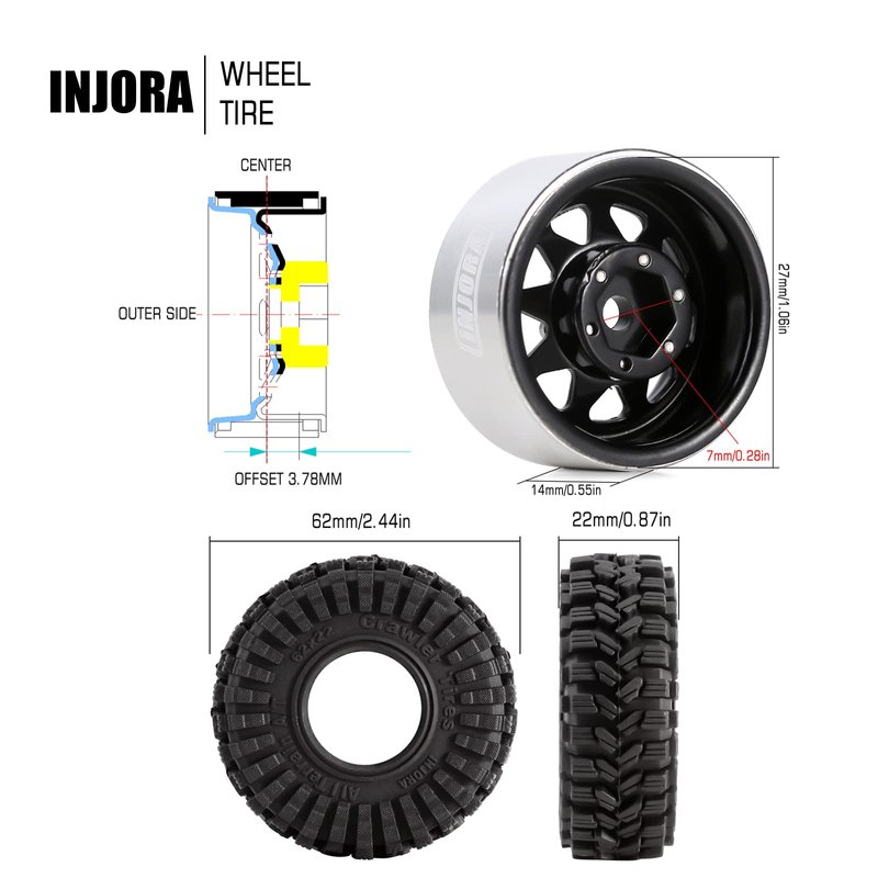 INJORA 1.0 Beadlock Wheel Tires Set -3.78mm Offset Wheel Rims for 1/18 1/24 RC Crawler Car Axial AX24 SCX24 FMS FCX24 TRX4M,Black(W1004-T1014)