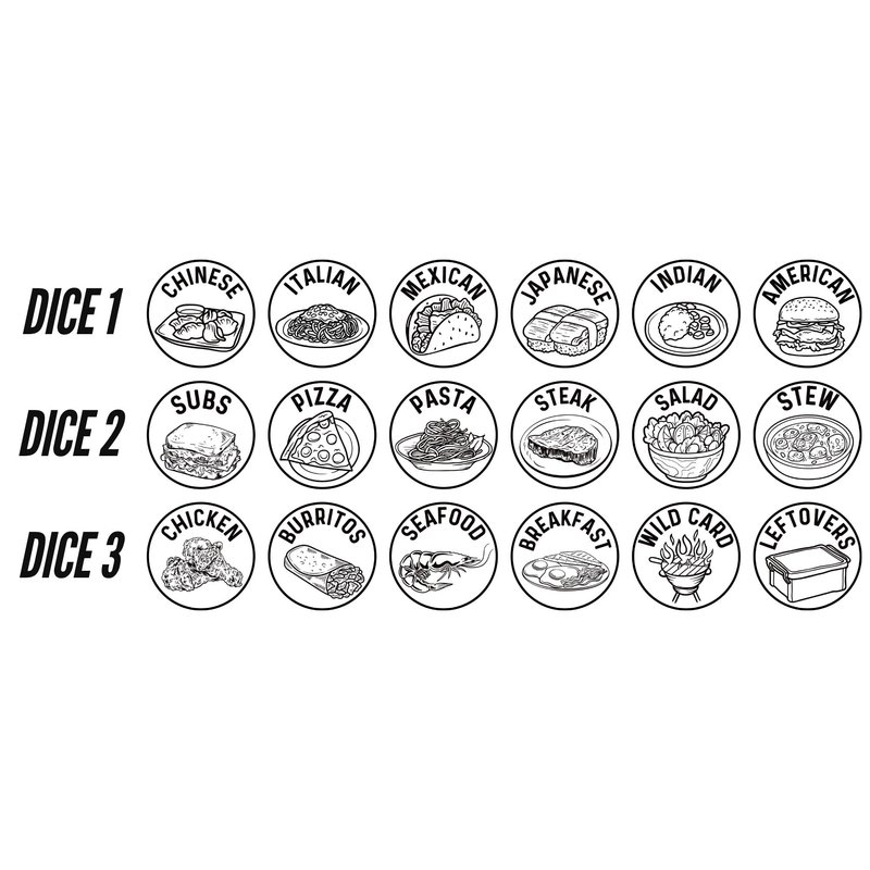 - [THREE THEMATIC DICE] Each die has a unique theme: restaurants (Chinese, Italian, Mexican, Japanese, Indian, American), cooking at home (Subs, Pizza, Pasta, Steak, Salad, Stew), and quick meals (Chicken, Burritos, Seafood, Breakfast, Wild Card, Leftovers)