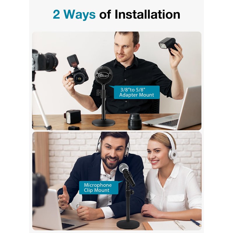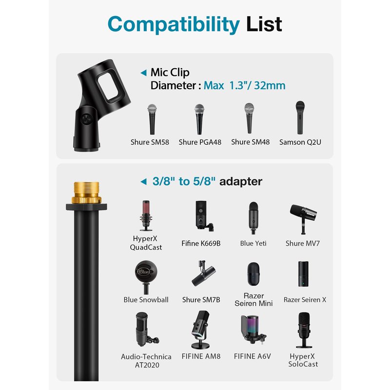 - Strong Compatibility: With a 3/8" to 5/8" adapter, the desk mic stand is compatible with Blue Yeti, Blue Yeti Pro, Blue Snowball, Hyper X QuadCast, SoloCast, Fifine, AT2020, Razer Seiren X, and other microphones. The package also comes with a mic clip with a max diameter of 1.26", compatible with dynamic microphones such as Shure SM58, Shure SM48, Samson Q2U, Shure PGA48, etc.