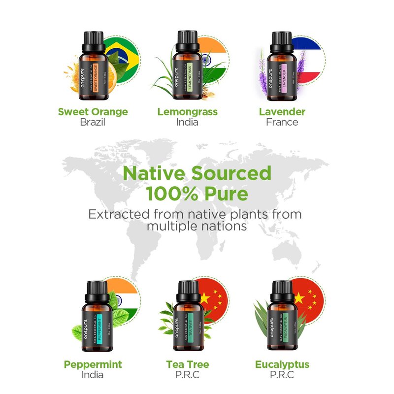 - Native Sourced, Bottled in the USA, 100% Pure: 6 scents include tea tree, lavender, eucalyptus, lemongrass, peppermint and sweet orange, which are extracted from native plants from multiple countries. With premium quality, each drop is 100% pure with no additives, fillers, bases or carriers added.