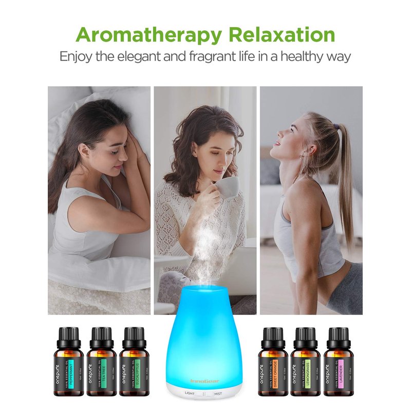 We all deserve to achieve a little more relaxation in life. Sometimes it could be as simple as taking a deep breath by using InnoGear upgraded aroma diffuser. This visually appealing essential oil diffuser with oils matches any decor. It takes essential oils and disperses moist mist throughout the air, keeping essential oil 100% natural without burning or heating, making your room smell great, keeping you relaxed and calm throughout the night.