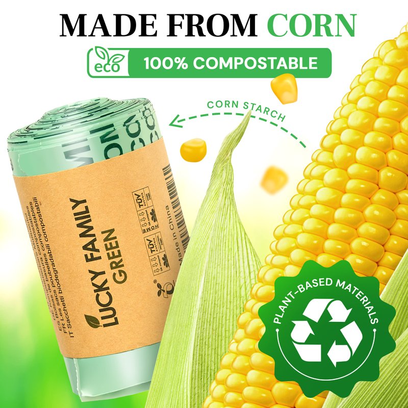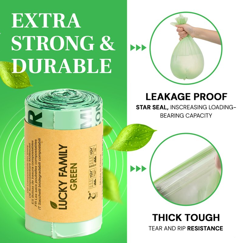 Lucky Family Green compostable trash bags are made of 100% corn starch material, based on natural renewable plant starch extracts, and can be composted in backyard or home composting facilities. In the case of composting, it is released as water, humus, and CO2 within six months and returned to the ecosystem to complete the organic cycle. Can be naturally decomposed in the natural without causing damage to the environment.