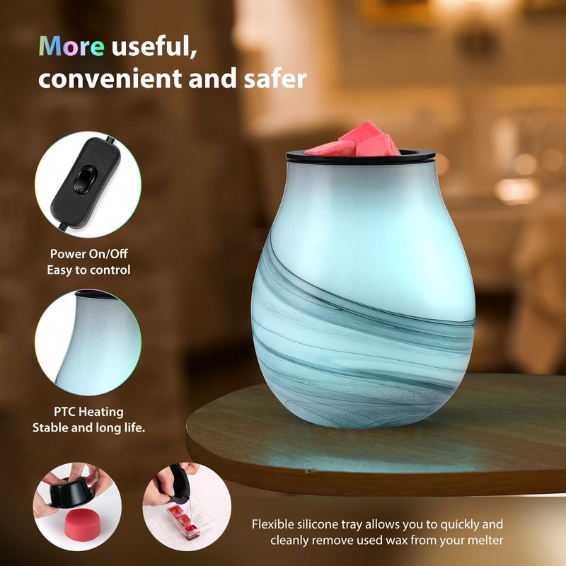 INNOVATIVE AND BRILLIANT :Inrorans electric wax melt warmer is designed with Led 7 colors changing as light and innovative PTC heating ,This oil warmer comes with replacement silicone tray ,Easy to remove and change wax melts,in addition,This oil burner is made in handmad glass, natural, Especially and Perfectly working with LED 7 colors changing, Those features are going for quality and smart electric candle warmer for candle making,dorm room, yoga.