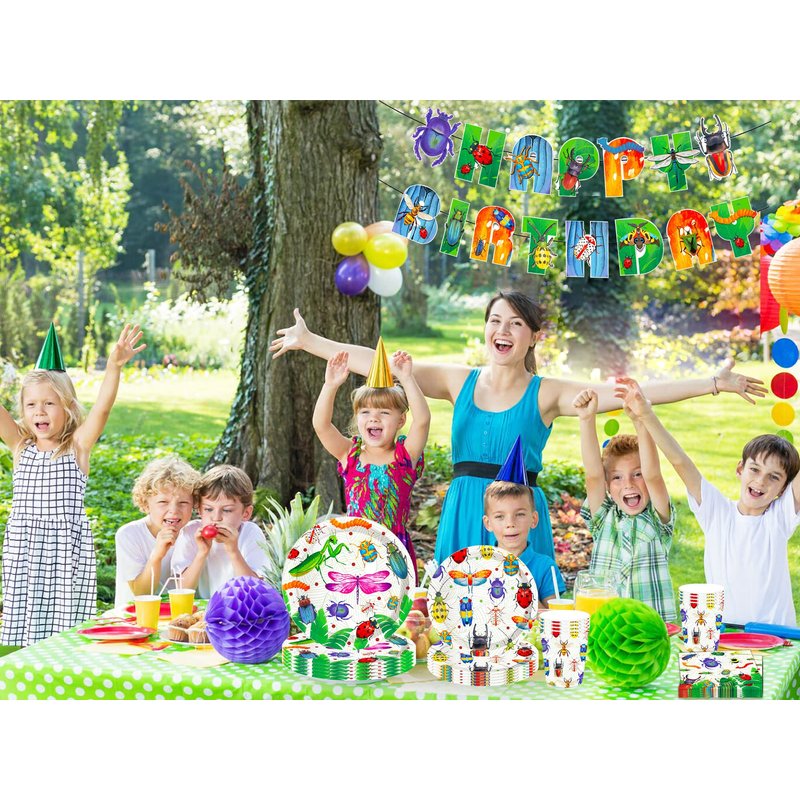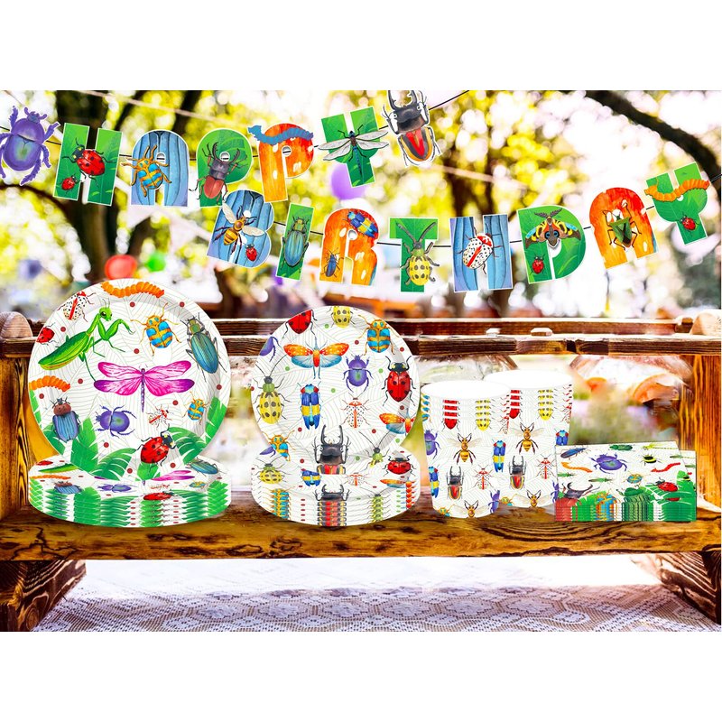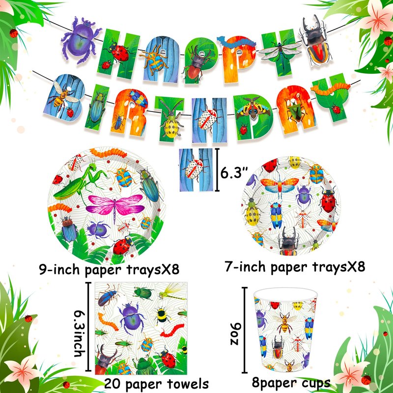 - What will you get? You will get 1 x Insect birthday banner, 8 x 9 inch Insect party plates, 8 x 7 inch Insect party plates, 8 x Insect party cups, 20 x Insect party napkins