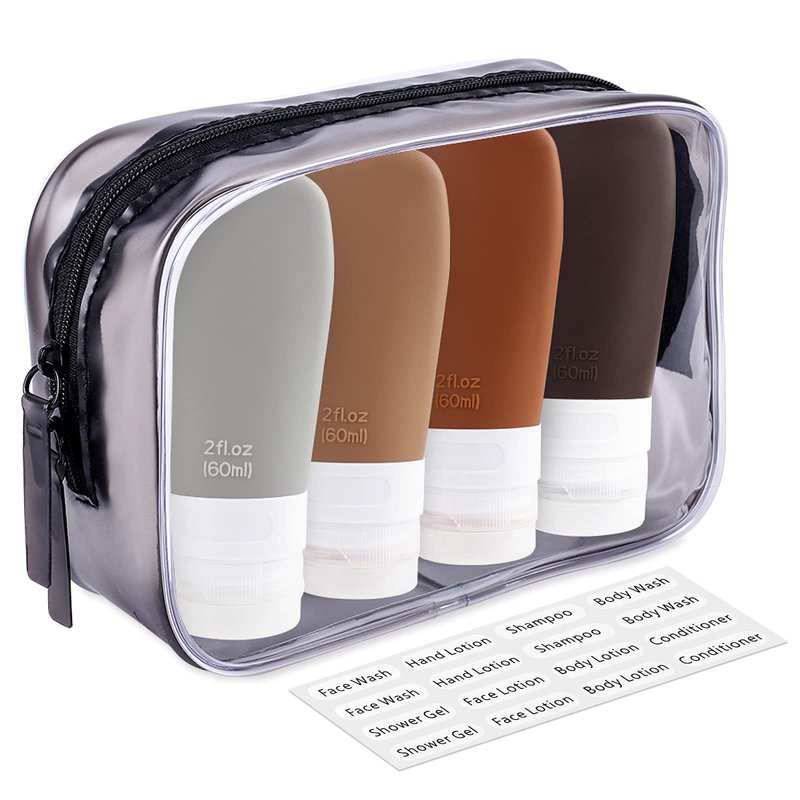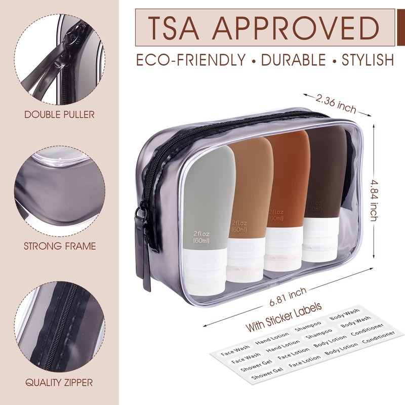 - TSA Carry on Approved: 4 pack 2 ounce silicone travel bottles, perfect for shampoo, conditioner, body wash, lotion, hand sanitizer, shower gel. Packed with a high quality zippered clear toiletry bag, saving space, easy to carry with for travels or gym workout.