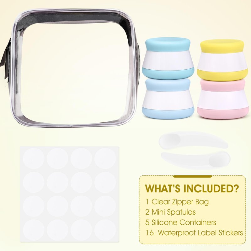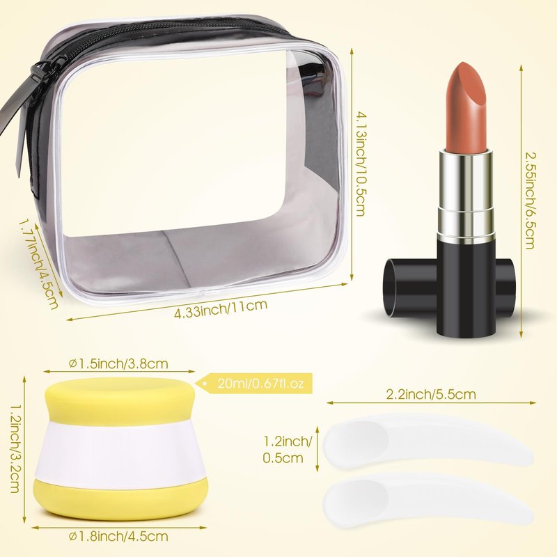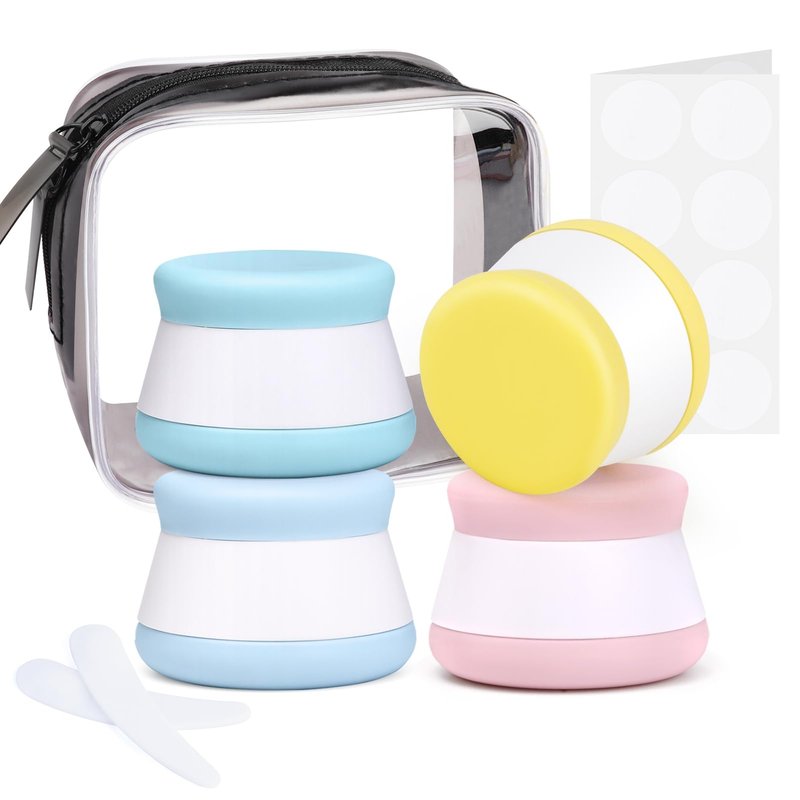 Our small travel containers set includes: travel jars for toiletries (20ml/0.68oz) x4 Clear Pouch x1 Mini Spatula x2 Waterproof Label Stickers x16 Pls kindly notice: 1, Our makeup containers set is for creams or gels, nothing runny. Thin liquids like water are not suggested. 2, Pls Remember: don’t fill to capacity, line up the rigid collar with the silicone container at the top lip before putting the lid on, and then screw the lid on carefully and firmly. All will be well! Make sure a small bit of the silicone sits above the white sleeve with no folds.
