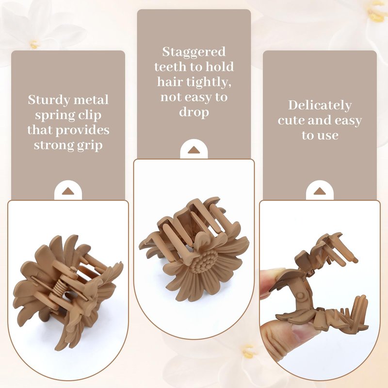 - Design: Embrace a blend of style and functionality with the elegant sunflower shape design of these plastic hair clips. The intricate detailing combined with interlocking teeth inside ensures a secure grip on various hair textures, preventing slippage and keeping your hair neatly in place throughout the day. This thoughtful design not only adds a charming floral touch to your hairstyle but also prioritizes practicality, making them an attractive and reliable choice for accessorizing any ensemble.