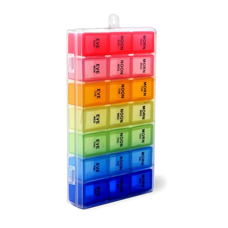 - Each day of the week has a different vivid color, Take the day's box out of the frame to carry the pills for the morning or afternoon with you.