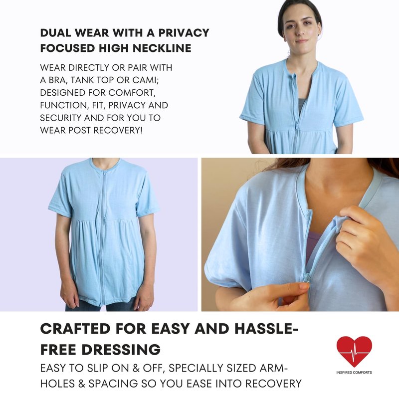 Mastectomy and breast surgery recovery shirt with easy open zipper and inner pockets for surgical drains. Designed to provide comfort, aid and maintain privacy for patients recovering from breast surgery and mastectomies. Soft comfortable cotton material, with lightweight hidden zippers offering privacy and ease of dressing. Pockets include fasteners to hold drainage tubes in place to prevent any entanglement. A larger size is recommended to account for potential bandages or sites with dressing or for those who prefer a more relaxed fit. Ideal for patients, caregivers, and medical professionals to help aid in recovery and healing. Our mission at Inspired Comforts is to provide comfortable, high quality and thoughtfully designed clothing and accessories to aid and make your journey as smooth, timely and carefree as possible. As a team inspired by patients and caregivers close to us, we understand how important it is to not have to think about every small detail when you deserve joy and comfort. We hope that with our collective experience, inspired solutions and attention to detail we can bring some joy and comfort to you.
