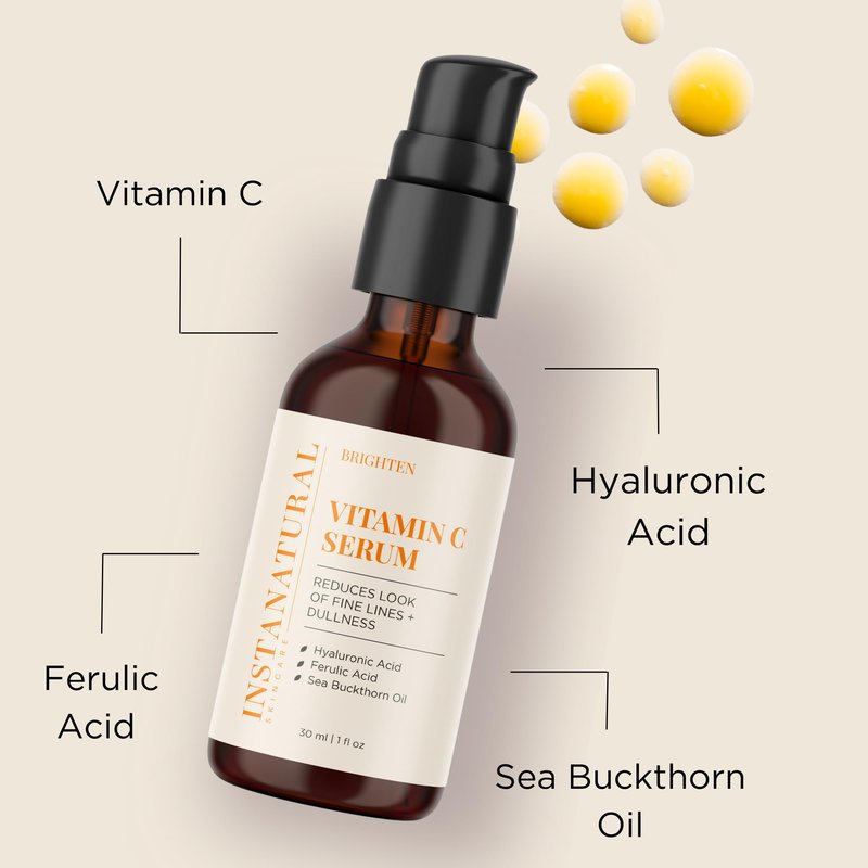 Brighten Up. InstaNatural Vitamin C Serum is packed with nutrients to brighten the skin and prevent common signs of aging such as the appearance of lines, wrinkles and discoloration. To enhance the antioxidant benefits of Vitamin C, our serum also includes Ferulic Acid to defend against environmental aggressors, as well as Hyaluronic Acid and Sea Buckthorn Oil to support the skin's protective barrier. At InstaNatural, our mission is to put people first by creating skincare that is botanically based, active-led, and proven to perform. Our skin care products are formulated without 1500+ ingredients such as parabens, sulfates, synthetic fragrance, PEGs, petroleum, and formaldehyde releasers. Our products are certified cruelty-free.