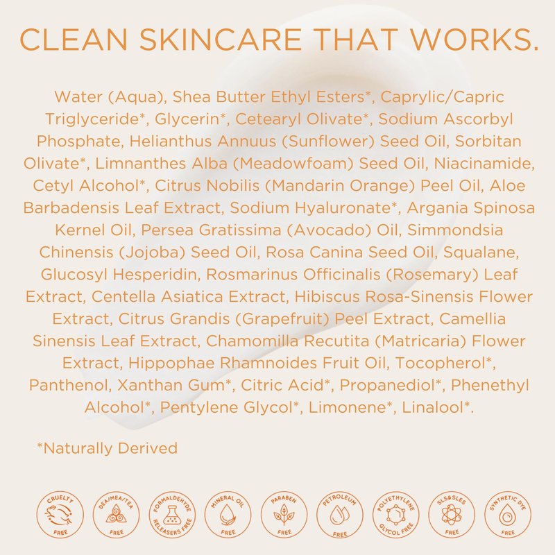- Clean Skincare that Works: This lightweight facial moisturizer combines Vitamin C, Aloe Vera, Niacinamide and Hyaluronic Acid to support collagen production and a healthy skin barrier for a radiant complexion