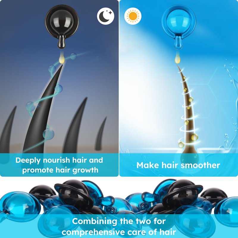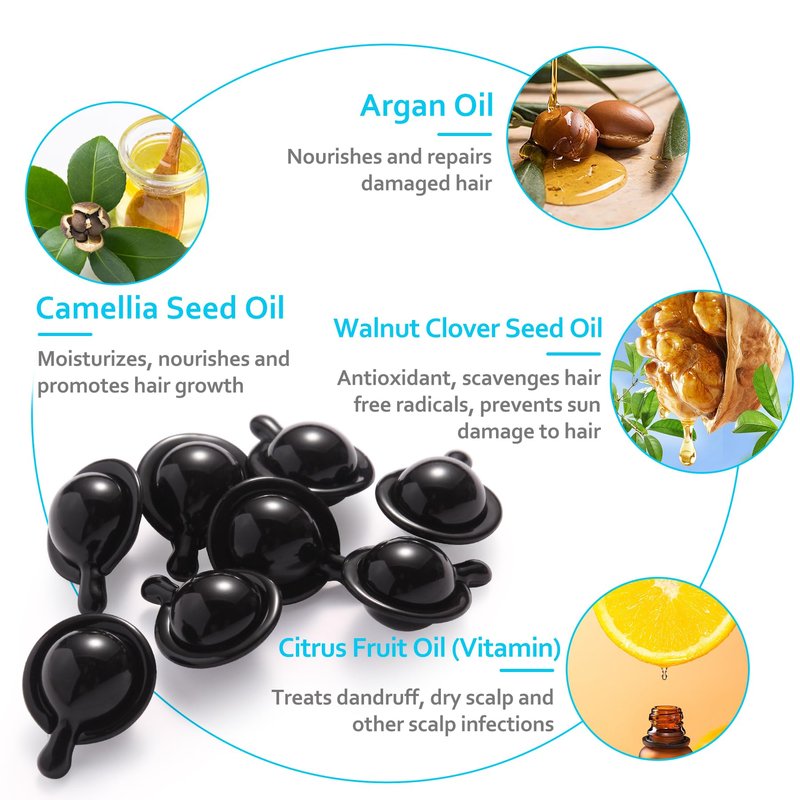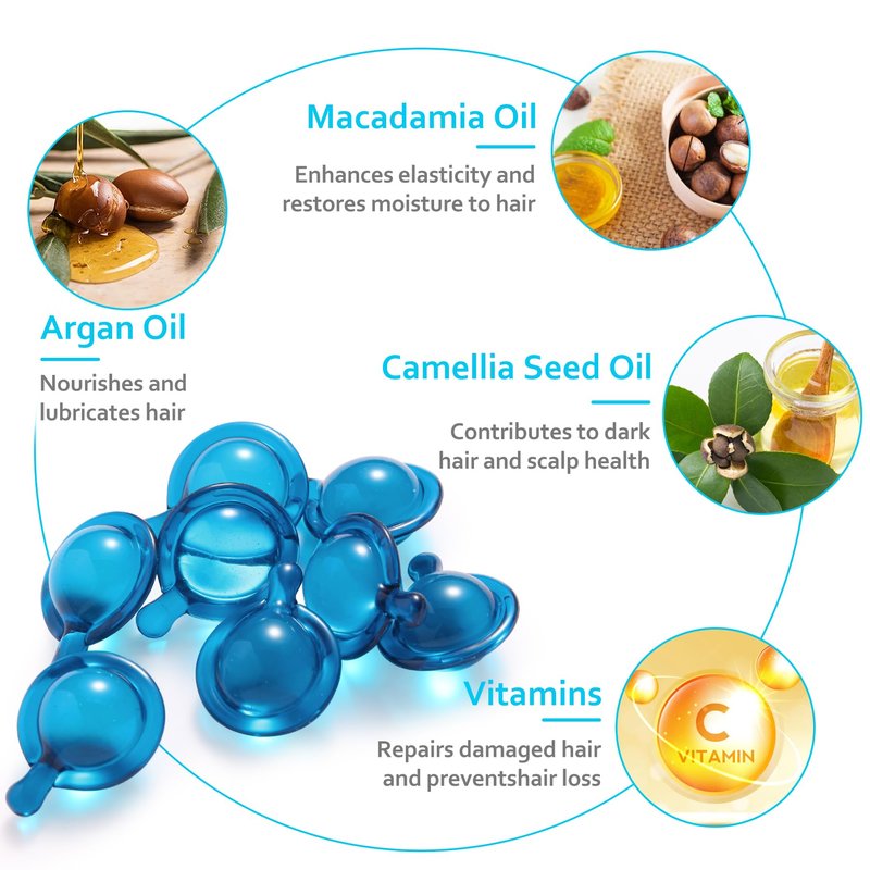 - DEEPLY NUTRIFYING:Hair oil capsules enriched with vitamins (A, C, E, Pro B5), macadamia and argan oils to repair frizzy and damaged hair and damaged hair and prevent split ends. Leaves your hair looking silky smooth and feeling soft for all occasions.