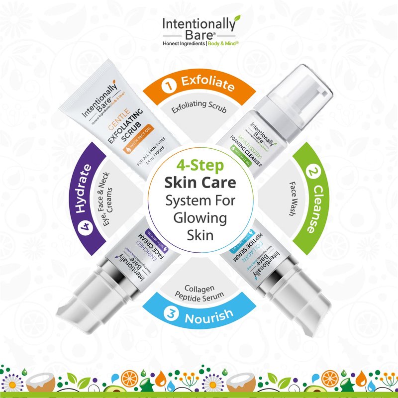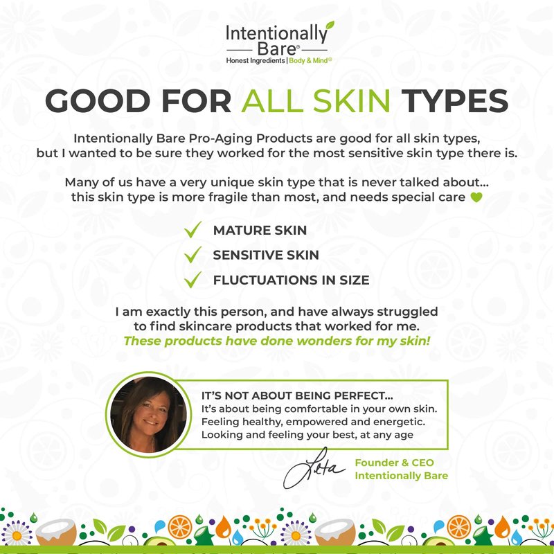 Formulated for women with mature skin that can be sensitive, that want the benefits of active, natural ingredients, without compromising on effectiveness. Redefine your skincare game with an all-new, natural, powerful Pro-Aging formula. With Intentionally Bare Foaming Face Wash you can gently scrub off any dirt, debris, and makeup without leaving your skin feeling stripped or dry. The gentle foaming action expels the yucky stuff from your cells. With its blend of powerful plant oils - including Aloe Vera, Witch Hazel, Rosemary, and Chamomile - our face wash does more than just cleanse your skin. The moisturizing, calming, and soothing elements pamper your delicate face area and bare’s your beauty. The reason we say this is like ‘Keto for Your Skin’ is because like keto, our products lower inflammation of the skin. When the skin isn’t inflamed, it’s more receptive to what we put on it. Using our natural ingredient skincare line with amazing active ingredients is a win-win for your skin! Our Intentionally Bare Foaming Face Wash works best when used with our Gentle Exfoliating Scrub, Collagen Peptide Serum and Enriched Face Cream. Pump a few times to extract foam as desired and apply to damp skin. Gently massage in circular motions, making sure to reach the under eye area, the neck and the decollate area. For best results use 2 times per day, morning and night.