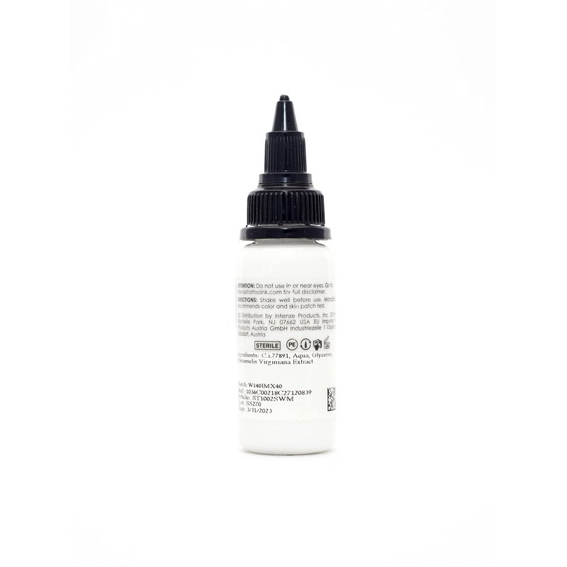 Intenze Snow White Mixing Tattoo Ink is the ideal mixing white to cut down on super high concentrated Intenze pigments. Pre-dispersed tattoo ink.