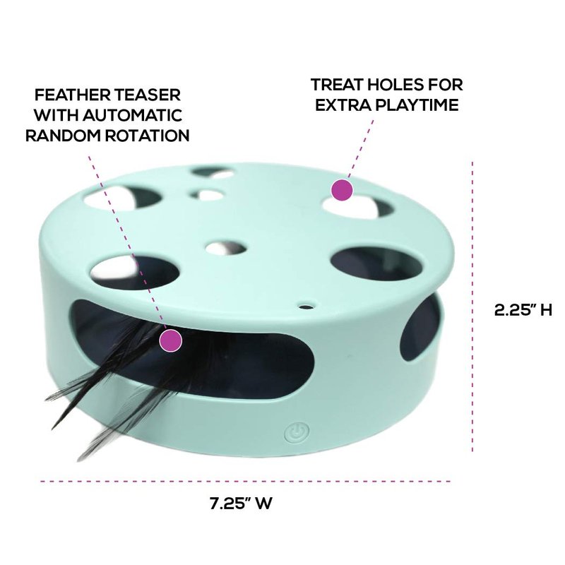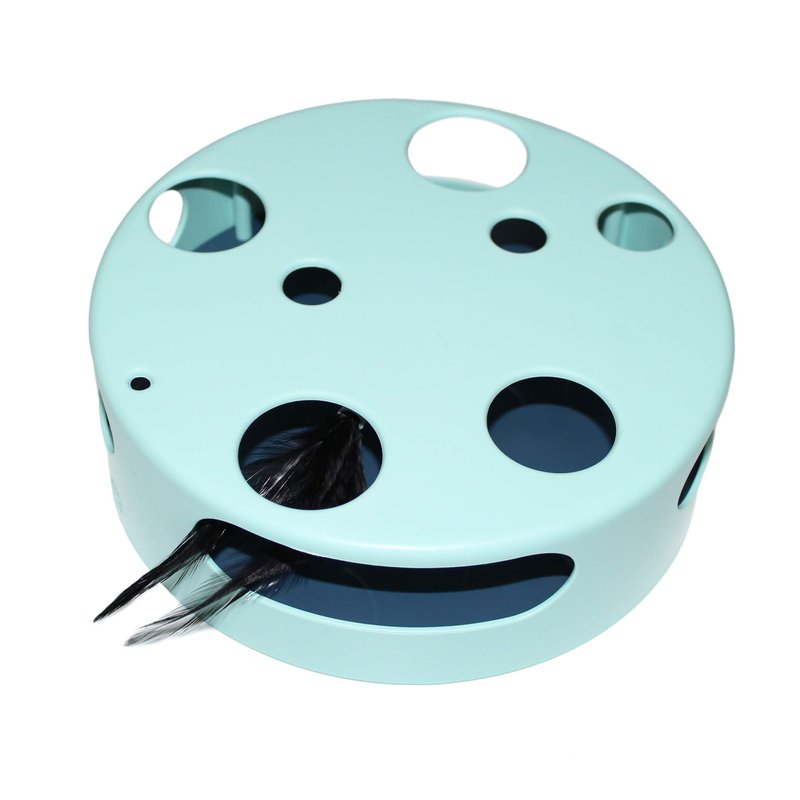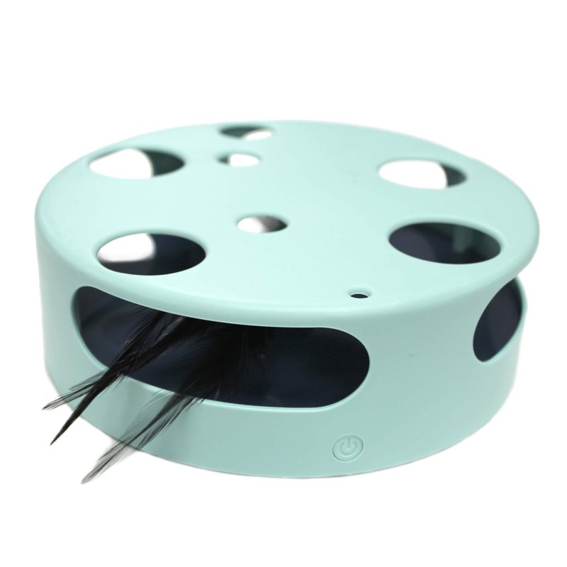 - SMART CAT TOY: The feather moves around its disc shape. While spinning, your cat will attempt to catch the feather through every hole. Set the power button on & watch as your cat attacks & has fun!