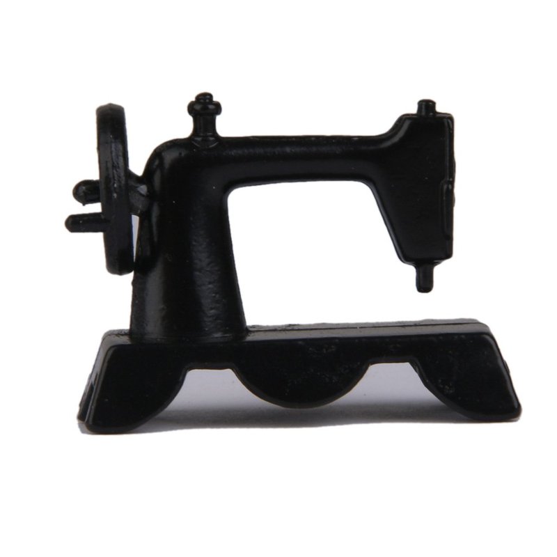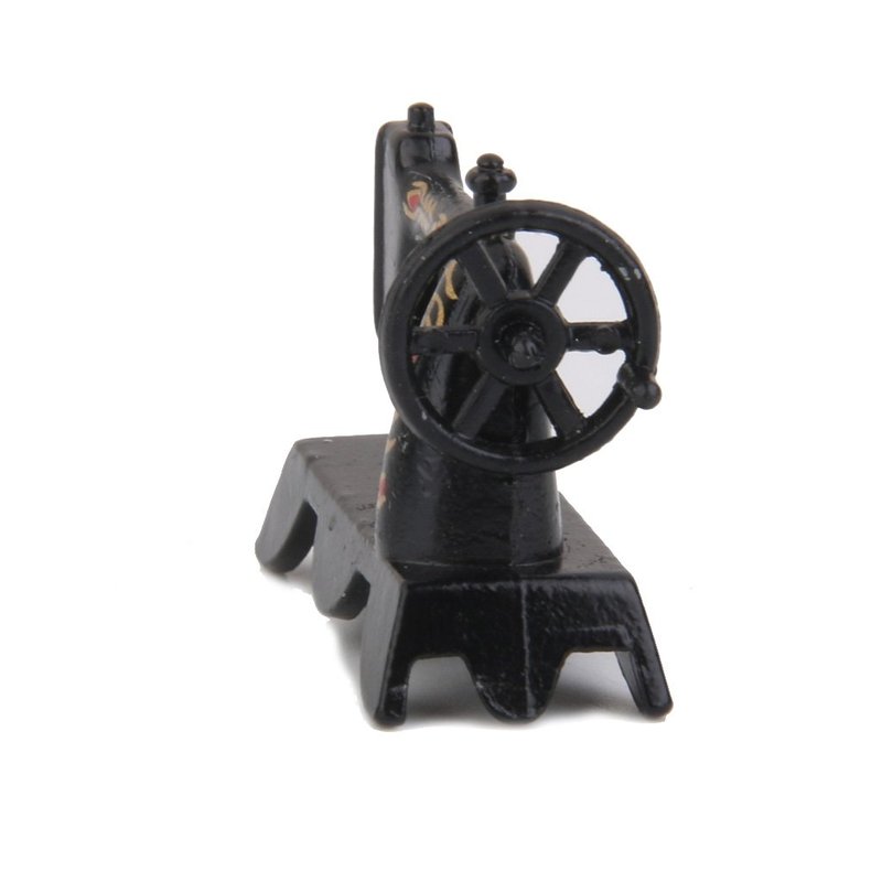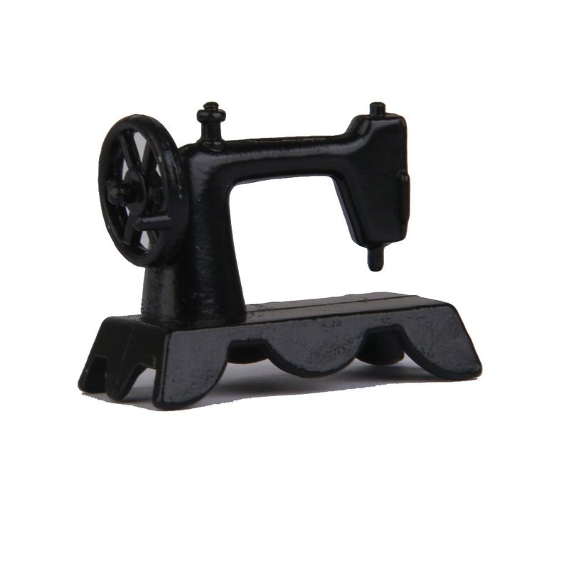 Portable Old Fashioned Sewing Machine - designed for the 1:12 scale Miniature setting by International Miniatures. Measures: 1 1/2 in wide x 1 1/16 in tall x 1/2 in deep. Made of painted metal.