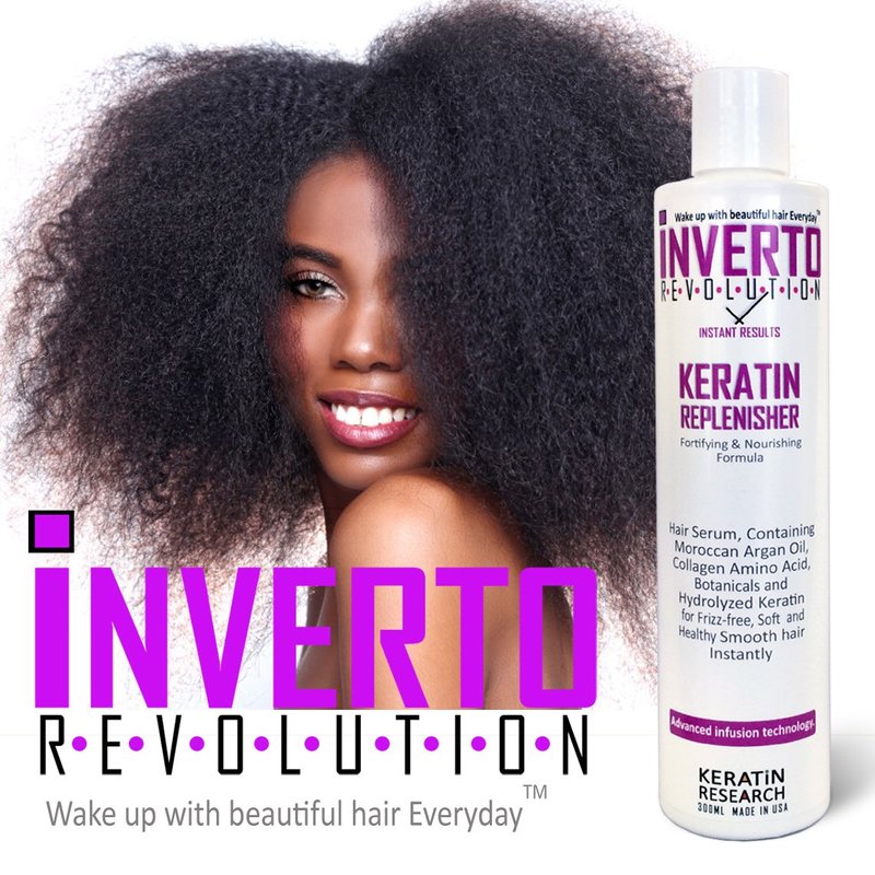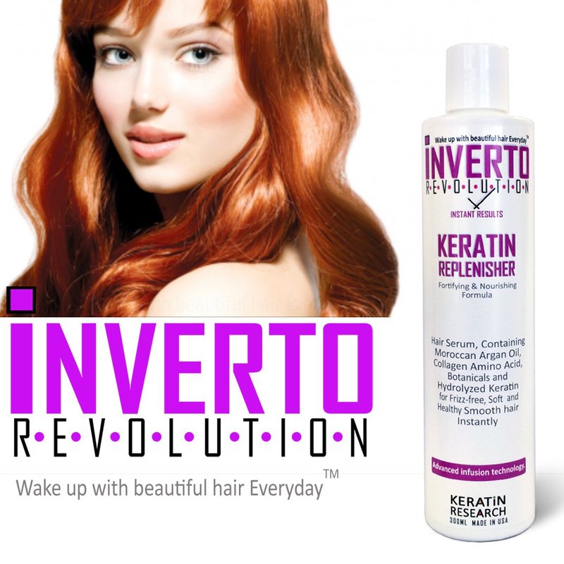 Inverto Keratin Replenisher 10oz Inverto Keratin Replenisher: Beyond the amazing performance and quality of this product, it's a Super Value! it is an 10oz bottle comparing to Keratin Complex and other brands who only give you 1.7oz. Our Keratin Replenisher: Triple Nourishing Fortifying & Conditioning Formula. Comes in a form of hair lotion, Containing Pure Moroccan Argan Oil, Botanicals and Inverto Hydrolyzed Keratin for Frizz-free, Soft and Smooth hair. by now you have learned that Inverto Products continuously delivering performance and great satisfaction. How does it work? The Replenisher opens the cuticle and enters to infuse Keratin proteins and emollients into the hair. Its deep penetrating action repairs and revitalizes hair during blow drying or ironing and closes the cuticle to entrap nourishment. Optimized for use as a maintenance to the Keratin Treatment and for any type of hair needing care.