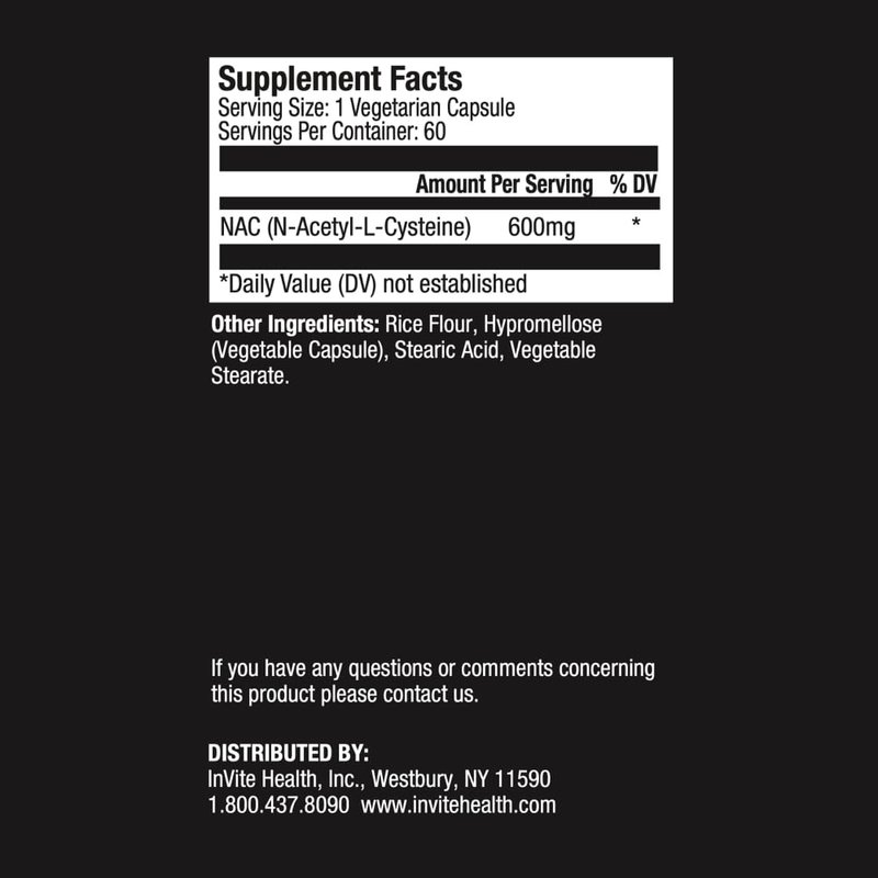 LIVER HEALTH SUPPLEMENT: InVite N-Acetyl-L-Cysteine (NAC) is a conditionally-essential nutrient needed by the body during times of stress, illness or recovery. Additionally, NAC is an amino acid that acts as an antioxidant. NOT AVAILABLE FOR SALE IN CALIFORNIA.