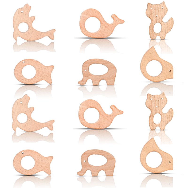 IoF 12 Pcs Teething Toys for Babies, Natural Wooden Teething Rings Baby Teether Chew Toys for Infant Toddler Teethers Crackers Animal Set Pain Relief Handmade Hanging Ring Set Toy