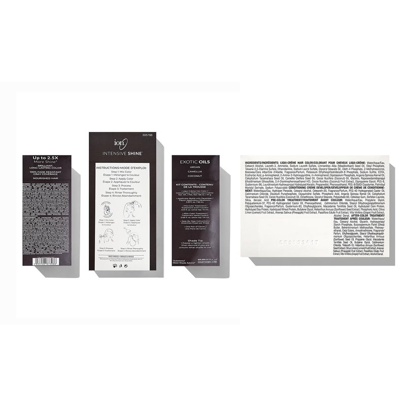 Intensive Shine has been formulated to provide maximum shine using a proprietary blend of Moroccan Argan Tahitian Tamanu Camellia and Coconut oils. This unique blend of precious oils provides brilliant color while helping to transform your hair from weak and dull to silky shiny and natural. Transform hair from weak and dull to smooth shiny and healthy. Brilliant long-lasting color. 100% fade resistant gray coverage. Non-Drip liqui-creme formula is easily applied. Pleasant fragrance. Complete kit contains: hair color pre-filled applicator bottle with ion Sensitive Scalp Creme Developer pre-color treatment after color treatment gloves and step by step instructions.