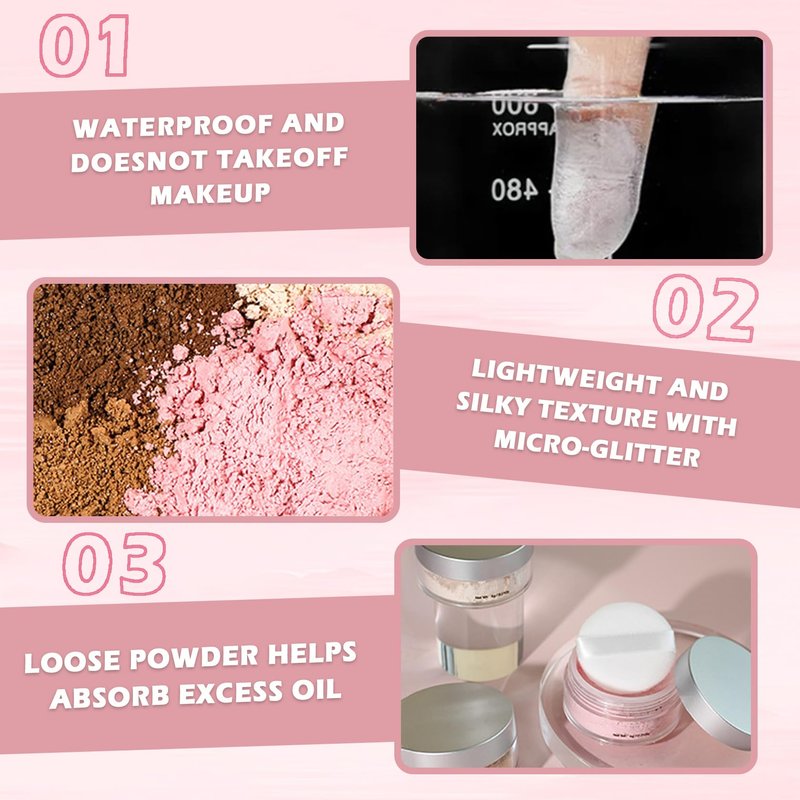 - 【Ultra-Fine Powder】Loose setting powder is made with fine glitter and ultra-fine powder, which blends into the skin easily and evenly, hiding pores, blurring fine lines and imperfections, and creating a velvety shimmery matte finish.
