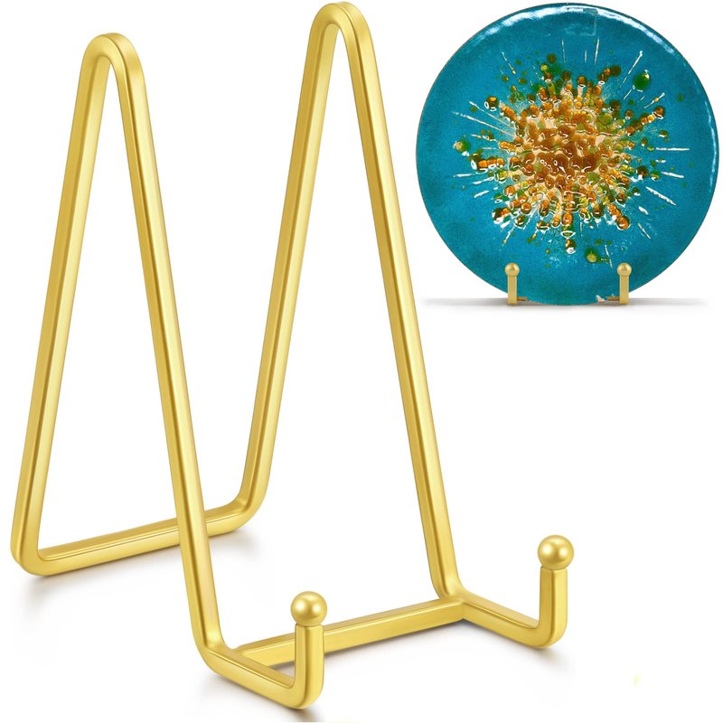- ELEGANT CONTEMPORARY DESIGN: - This picture frame stand has a unique square edge design and a relatively thicker matte gold powder-coated finish that will give any display item a sleek and modern look. It is perfect for the home table, office, banquet or showroom and will help make your display item shine.
