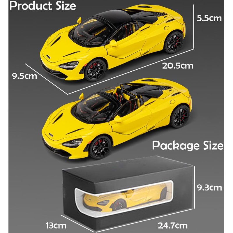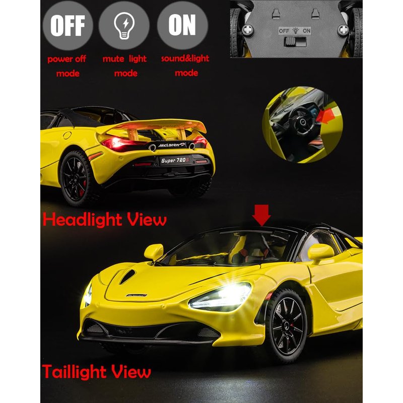 iPariser McLaren 720s Toy Cars Roadster Model 1/24 Yellow Alloy Collectibles Die-cast Vehicles with Sound and Light