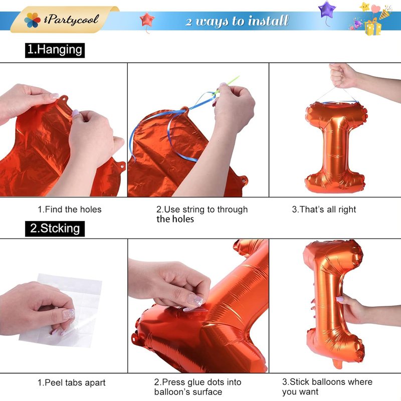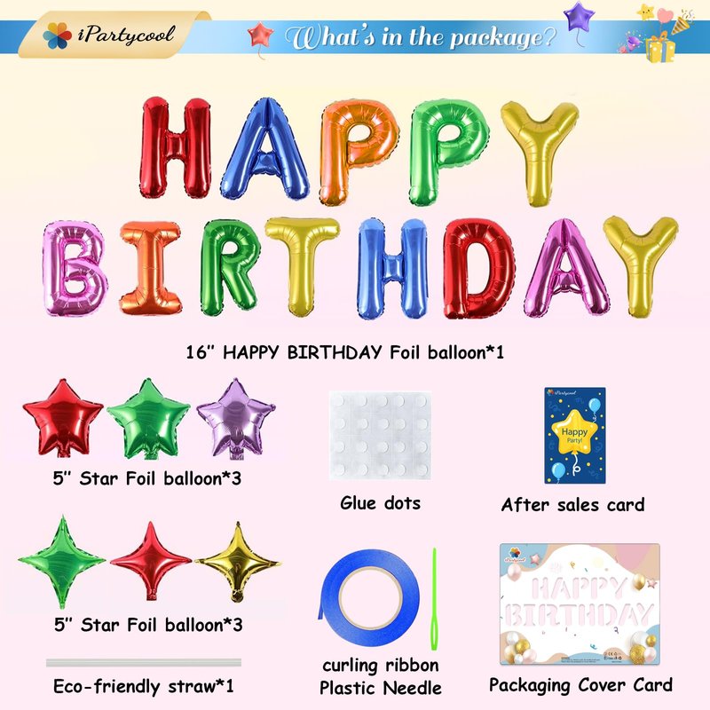 - 🎊What will you Get🎊: 13pcs 16" Happy Birthday Balloons, 6pcs 10" Star Balloons, 20 Glue dots, 32ft Ribbons, 1pcs Ecofriendly straw and needle, iPartycool Customer Card and Custom Packaging. It is atmospheric and beautiful, our birthday decorations very suitable for decorating birthday parties with various themes indoors and outdoors party decorations.