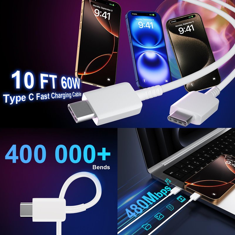 - 60W 10FT iPhone 15 16 Charger Fast Charging Cord- The 10 FT extra long USB-C to USB-C cord equips automatic chip recognition function, full support with iPhone 15 series. And the 10 foot (3meter) charging cable length allows you charge your iPhone and iPad models from long distance, make your life more easier and convenient.