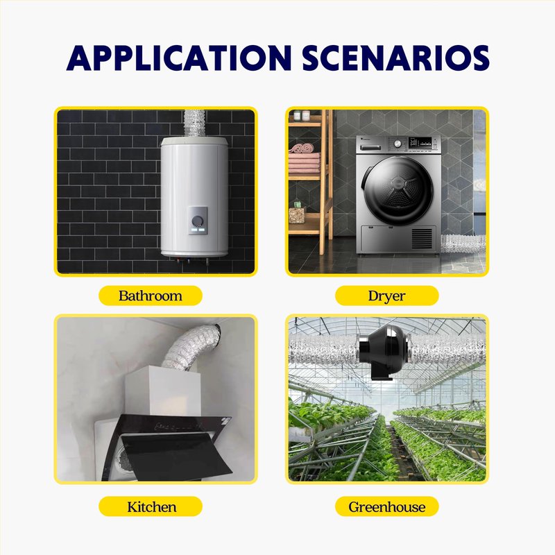 - Applications: kitchens (cooking exhaust), green houses and grow rooms (air circulation, intake, exhaust and light fixture cooling), bathrooms (smell and moisture exhaust), grow tents, etc.
