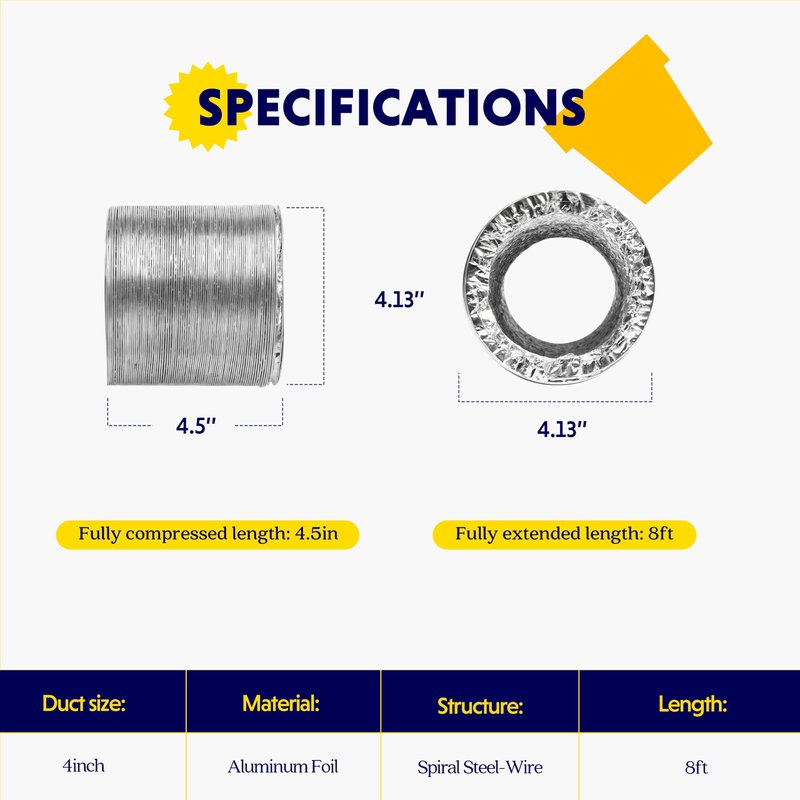 - Specs: material: Aluminum foil + PET; size: 4inches (diameter) x 8feet (length) when fully extended. Temperature endurance range from 0 ~ 185°F. (-18℃ ~ 85℃).