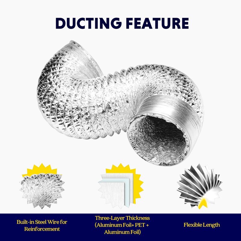 - Ducting feature: built-in steel wire for reinforcement and long lasting performance. Flexible length for inline fan; when not in use, it takes up little space.