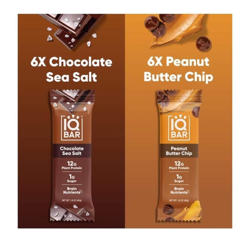 Iq-BAR Brain and Body Keto Protein Bars Variety Pack- Chocolate Sea Salt and Peanut Butter Chip - 12 Count Energy Bars - Low Carb Protein Bar - High Fiber Vegan Bars Low Sugar Meal Replacement Bar.