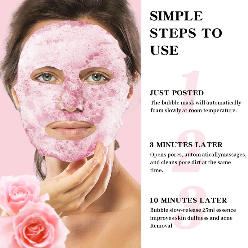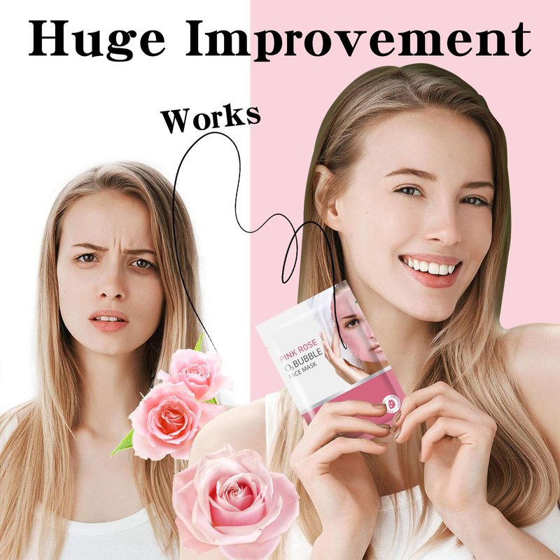 - PINK ROSE O2 BUBBLE FACE MASK: Rose is a very gentle, safe, effective skincare and good smell ingredient that has antioxidant properties and helps to brighten the skin, firm skin, and moisturizing skin, for a firmer, younger look. The rose-foaming oxygenating face mask was gentle yet effective. The antioxidant properties of roses help brighten and firm your skin, leaving it moisturized and youthful. can feel the nourishing effect it has on your complexion after continuing to use it.