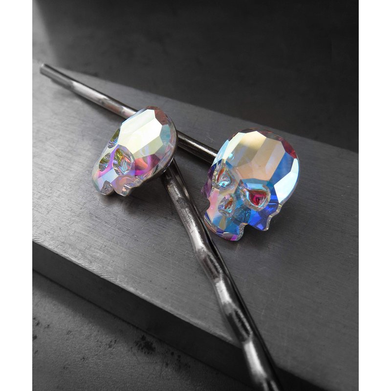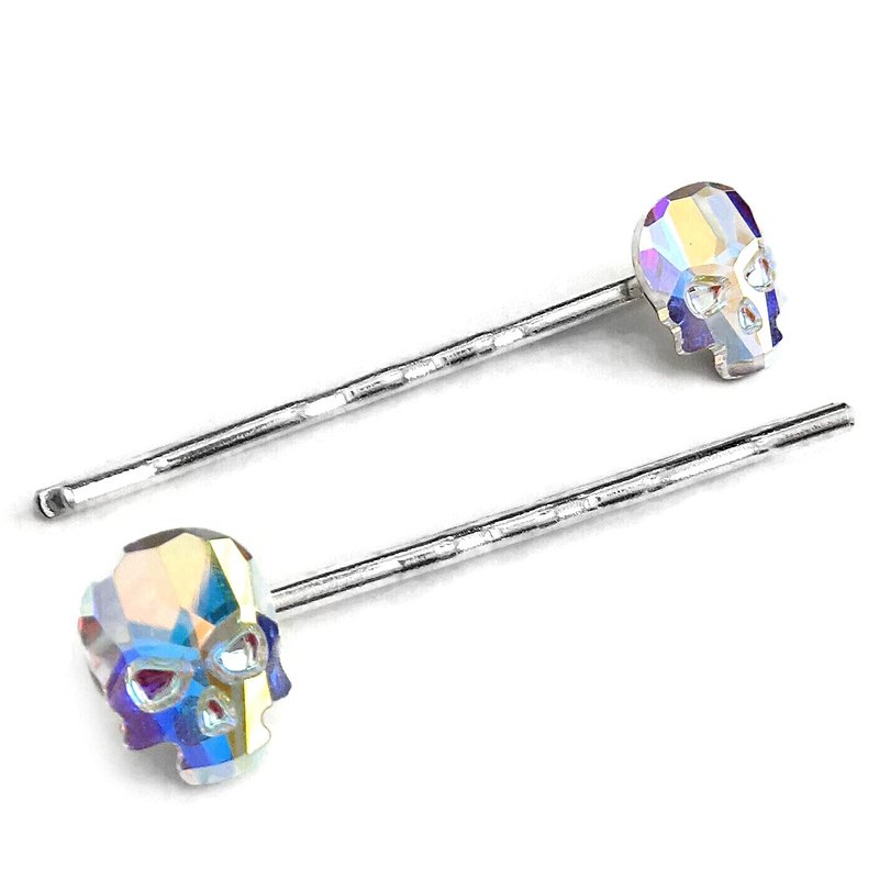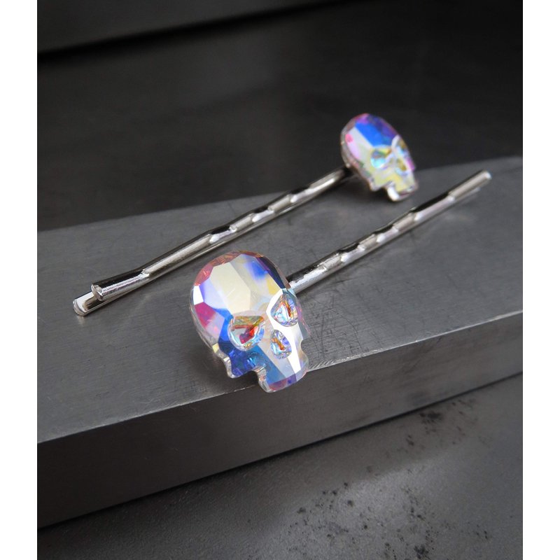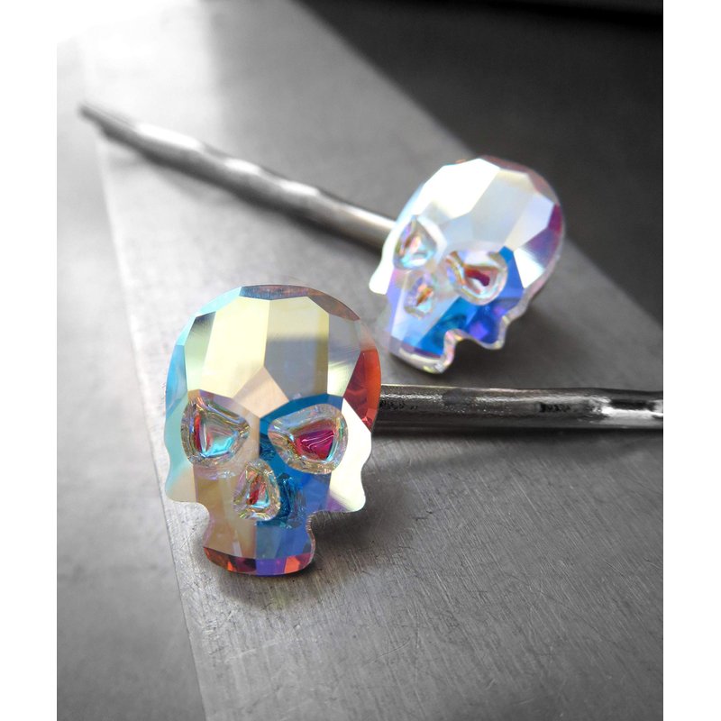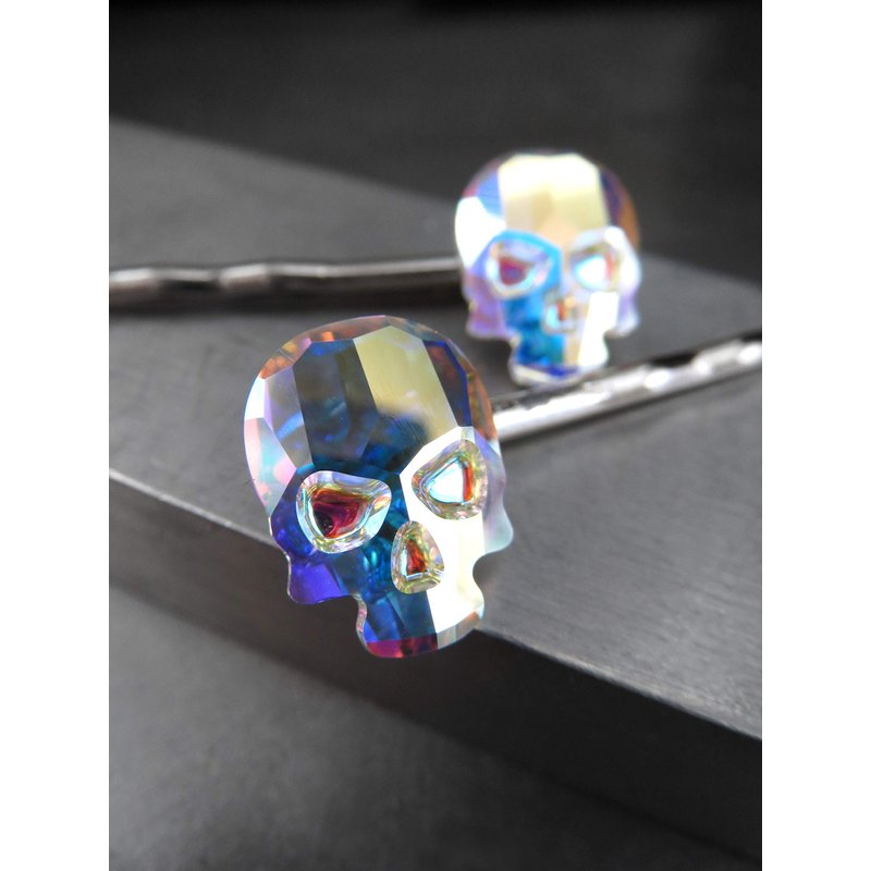 Set of 2 crystal skull hair pins in 'Crystal AB' color - a sparkling, shimmering crystal with mystical iridescent flashes of color: soft yellow, intense blue, bright pink & mint green. Please note: each set of 2 pins both a right side mounting & a left side mounting.