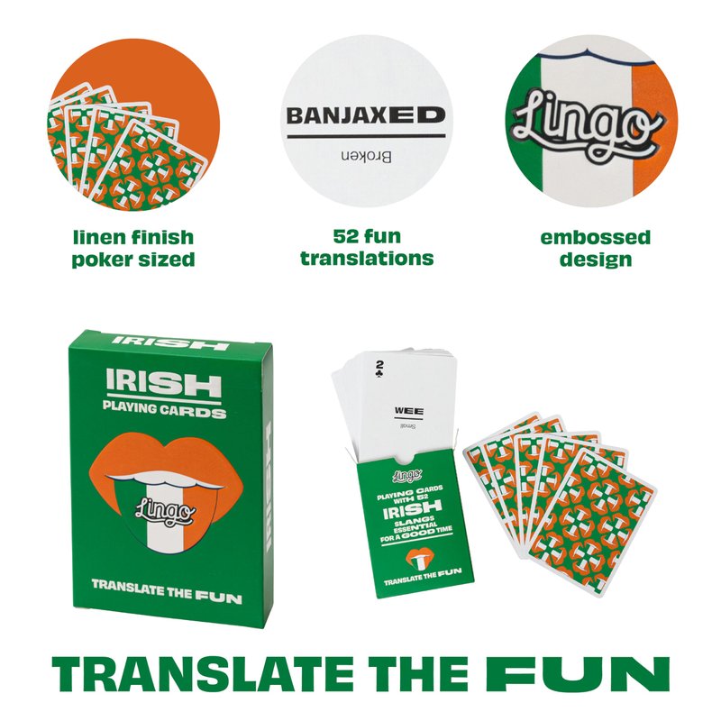 - EXPLORE AND PLAY ENDLESS – You can now learn Irish slang and play your favorite card games like Poker, Black Jack, Spoons, Rummy, Go Fish, Memory, Crazy Eights, Hearts and Solitaire. Trust us, with these cards in your hand, you'll be the one everyone's talking about. Order your Lingo Playing Cards today and get ready for the most fun and exciting game night yet!