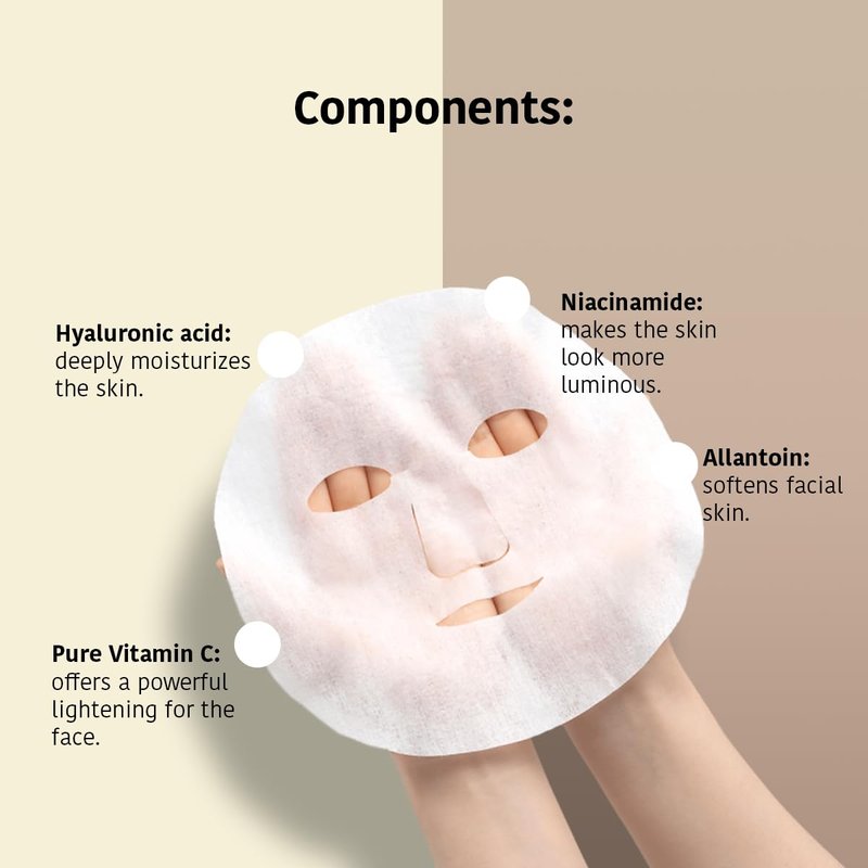 - FACIAL MASK: This is an illuminating face mask with Vitamin C and hyaluronic acid. It helps prevent and reduce the appearance of spots. It smooths imperfections, improves hydration, boosts skin radiance and is free of allergens.s. This mask has been tested for effectiveness and will reveal brighter and more hydrated skin in 15 minutes. Pack - Contains 5 pieces