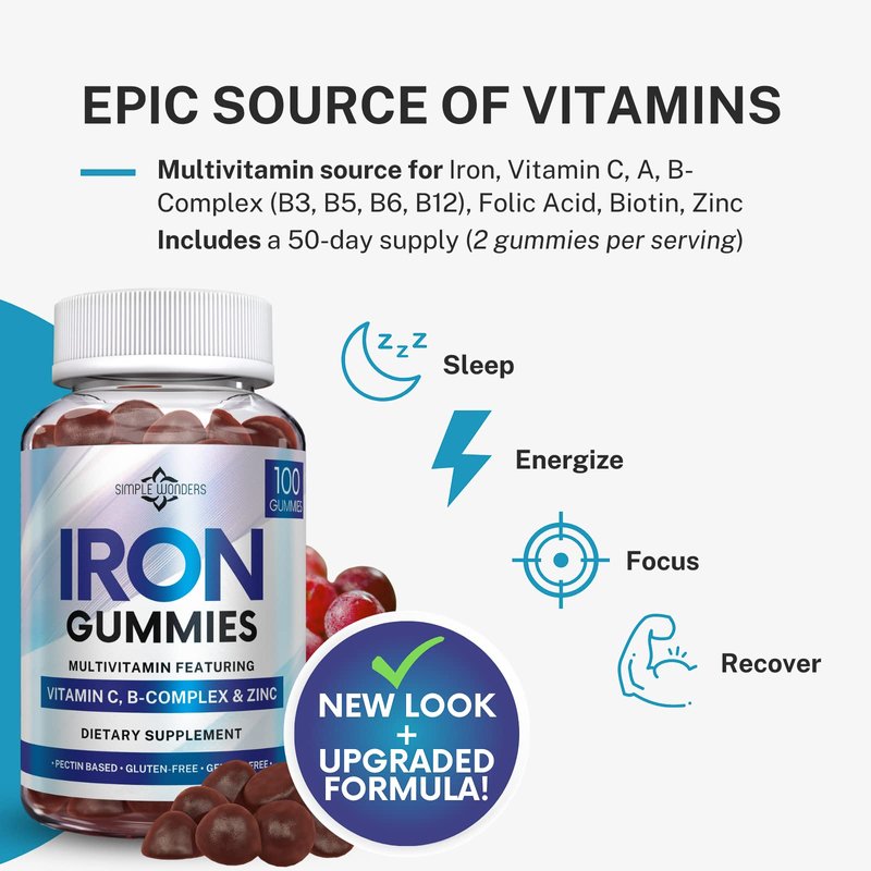 - IRON GUMMIES FOR ALL AGES: No matter your age, maintaining balanced levels of iron is important. Our iron gummies help with immune defense and alleviation of iron deficiency symptoms such as anemia, fatigue, poor focus, and muscle metabolism.*