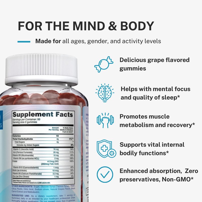 - MULTIVITAMIN WITH IRON GUMMY: Each bottle contains 100 delicious naturally grape-flavored chewable iron gummies that are an excellent source of Iron (Fe), Vitamin C, A, Vitamin B Complex (B3, B5, B6, B12), Folic Acid, Biotin, and Zinc.*