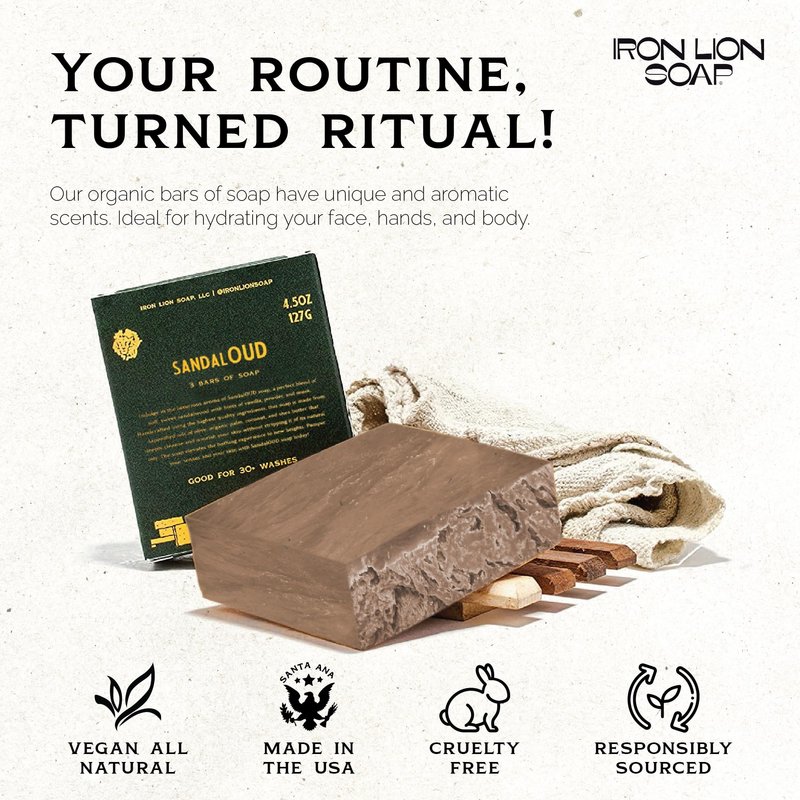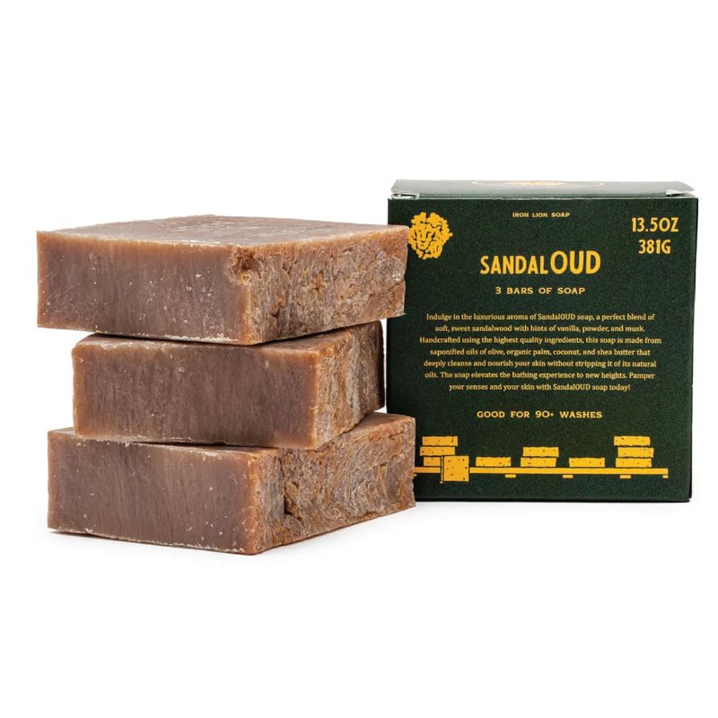 Iron Lion Soap - SandalOUD Organic Soap Bar - Made in USA - Plant Based, Vegan, Cold Process Handmade Soap - Moisturizing Bath Soaps for All Skin Types - (3 Pack)