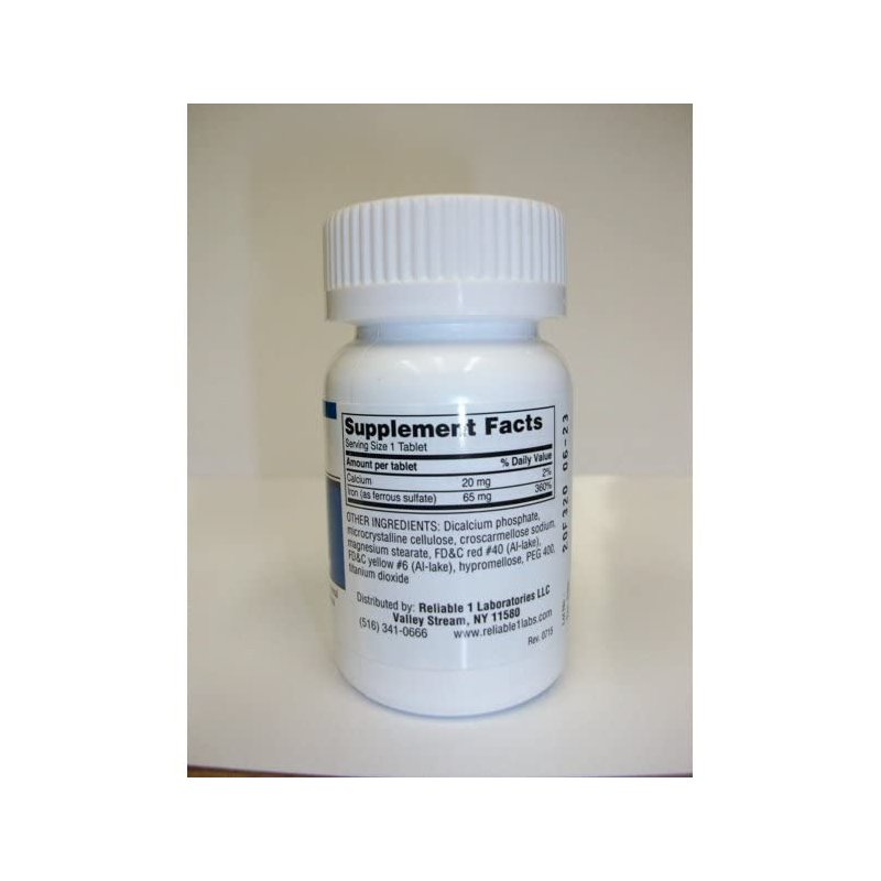 Iron Supplement. Each tablet contains 65 mg of elemental iron, equivalent to 325mg of ferrous sulfate which provides 360% of daily value.