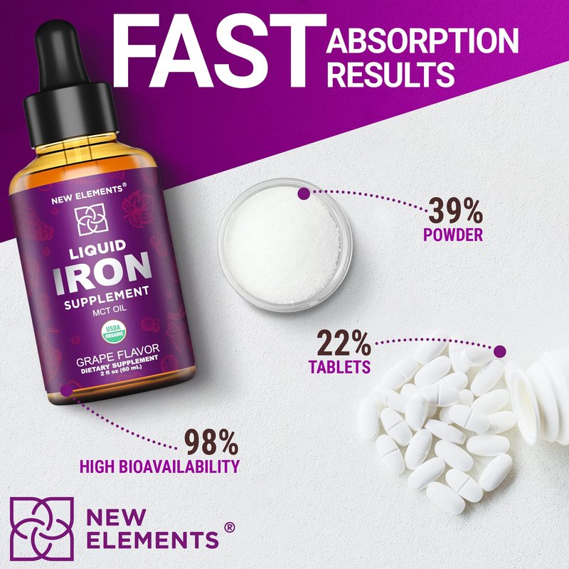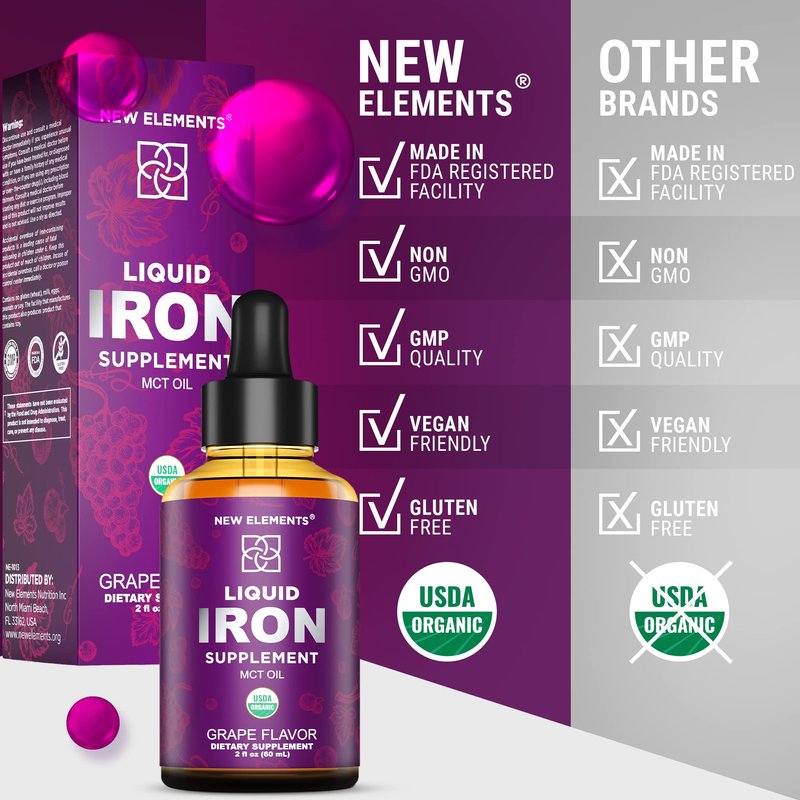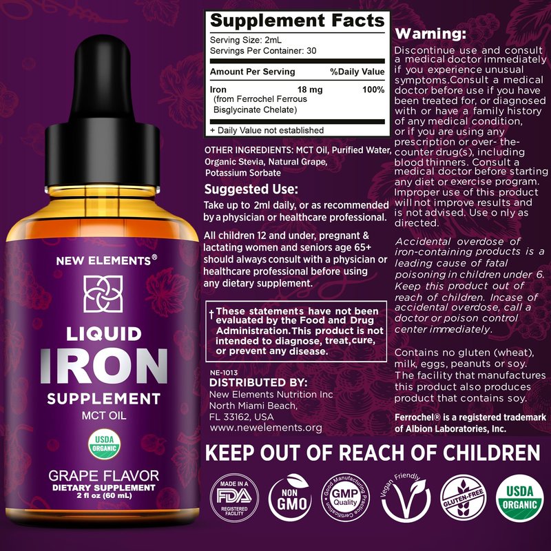 Iron Supplement for Women & Men Free Blood Builder, Iron Vitamin for Anemia USDA Organic Liquid Iron Drops for Adults with MCT Oil, Natural Grape Flavor, Faster Absorption & Immune Support, 2 Fl Oz
