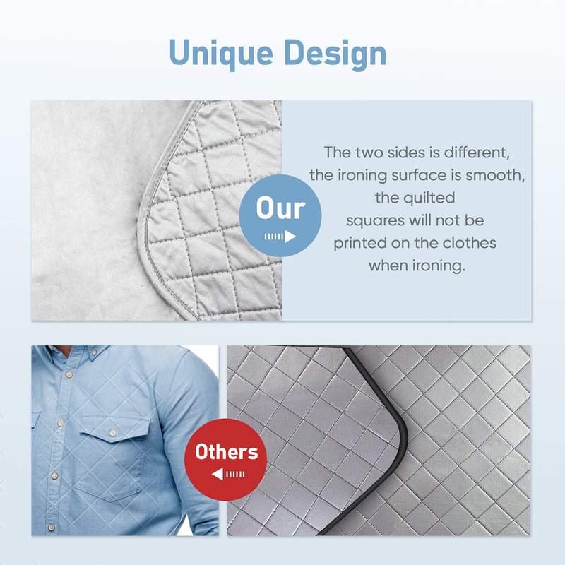 - Unique Design of Ironing Mat Surfaces: The two sides of this ironing pad are different,the ironing surface is smooth,convenient and fast to iron clothes and don't have to worry that the square imprint leaves on your shirts.