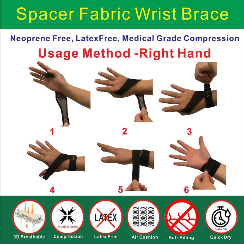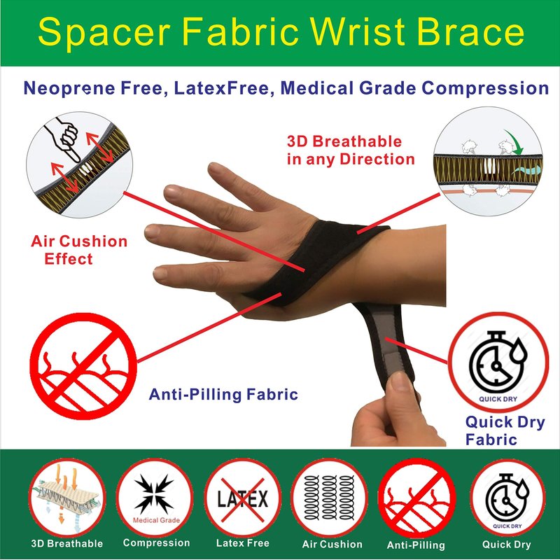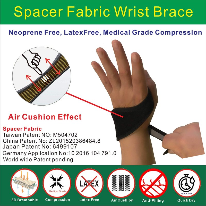 - Neoprene Free, No Smell, Latex Free, Hypo-allergenic. Made by 3D breathable, soft touch, elastic Patented Spacer fabric. Inside brace is made by quick dry moisture wicking yarn. 24 hours comfort use