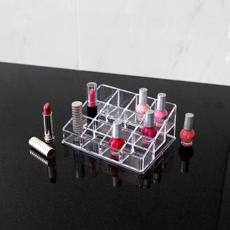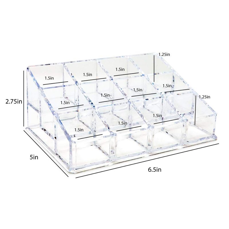 - STORAGE SOLUTION: This compact yet stylish acrylic organizer is simple yet modern. It holds up to twelve (12) items and displays them on three tiered rows of four. The stand, with individual square sections, keeps small supplies separated, tucked away, and clutter free while being held together in one convenient location