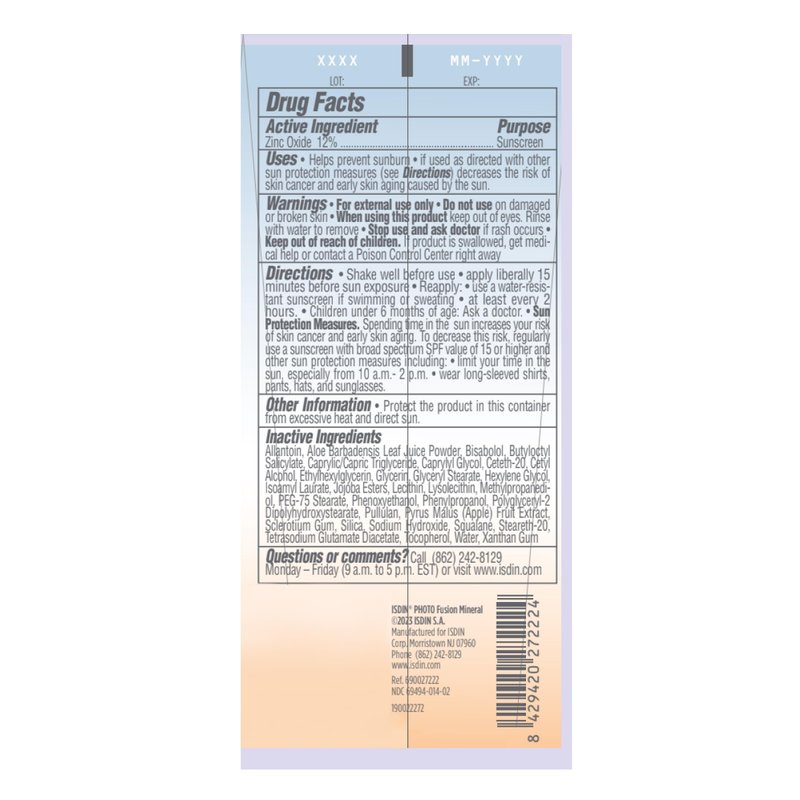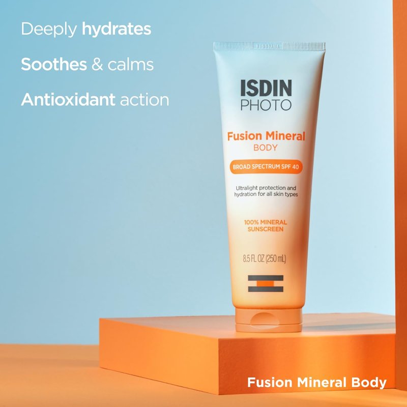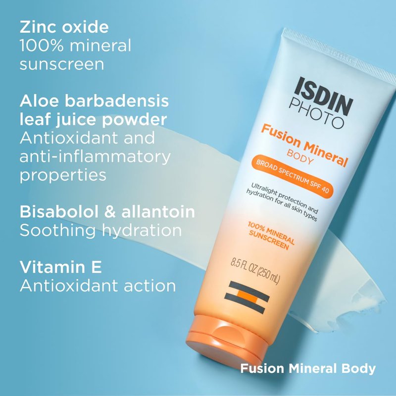 ISDIN Fusion Mineral Body Ultralight SPF 40 Broad Spectrum 100% Mineral Sunscreen. Featuring an advanced combination of ingredients and ultralight texture, this 100% mineral zinc oxide sunscreen works to protect and hydrate the skin. Effectively protects against UV radiation while moisturizing and soothing the skin. Formulated with aloe barbadensis leaf juice powder and vitamin E to also boost antioxidant action. Paraben, silicone, and fragrance free formula suitable for all skin types. Apply 15 minutes before sun exposure, making sure to reapply at least every 2 hours. Clinical results showed1: +30% hydration after 15 minutes -23% transepidermal water loss after 15 minutes 1Data on file. ISDIN Corp, 2024. Morristown, NJ. Ingredients: Active Ingredient: Zinc Oxide 12%. Allantoin, Aloe Barbadensis Leaf Juice Powder, Bisabolol, Butyloctyl Salicylate, Caprylic/Capric Triglyceride, Caprylyl Glycol, Ceteth-20, Cetyl Alcohol, Ethylhexylglycerin, Glycerin, Glyceryl Stearate, Hexylene Glycol, Isoamyl Laurate, Jojoba Esters, Lecithin, Lysolecithin, Methylpropanediol, PEG-75 Stearate, Phenoxyethanol, Phenylpropanol, Polyglyceryl-2 Dipolyhydroxystearate, Pullulan, Pyrus Malus (Apple) Fruit Extract, Sclerotium Gum, Silica, Sodium Hydroxide, Squalane, Steareth-20, Tetrasodium Glutamate Diacetate, Tocopherol, Water, Xanthan Gum.